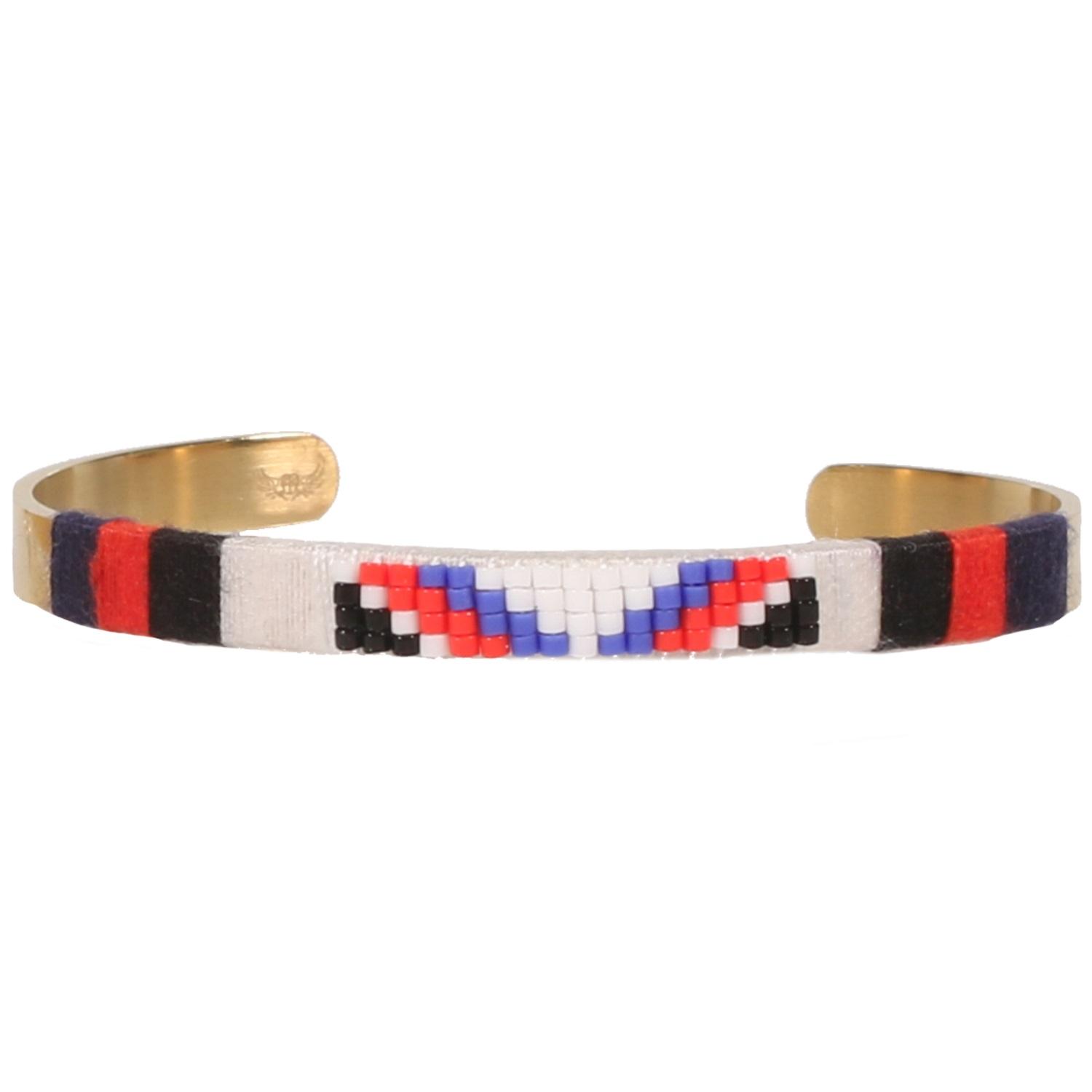 Bracelet jonc rigide en acier doré, rocaille et textile.