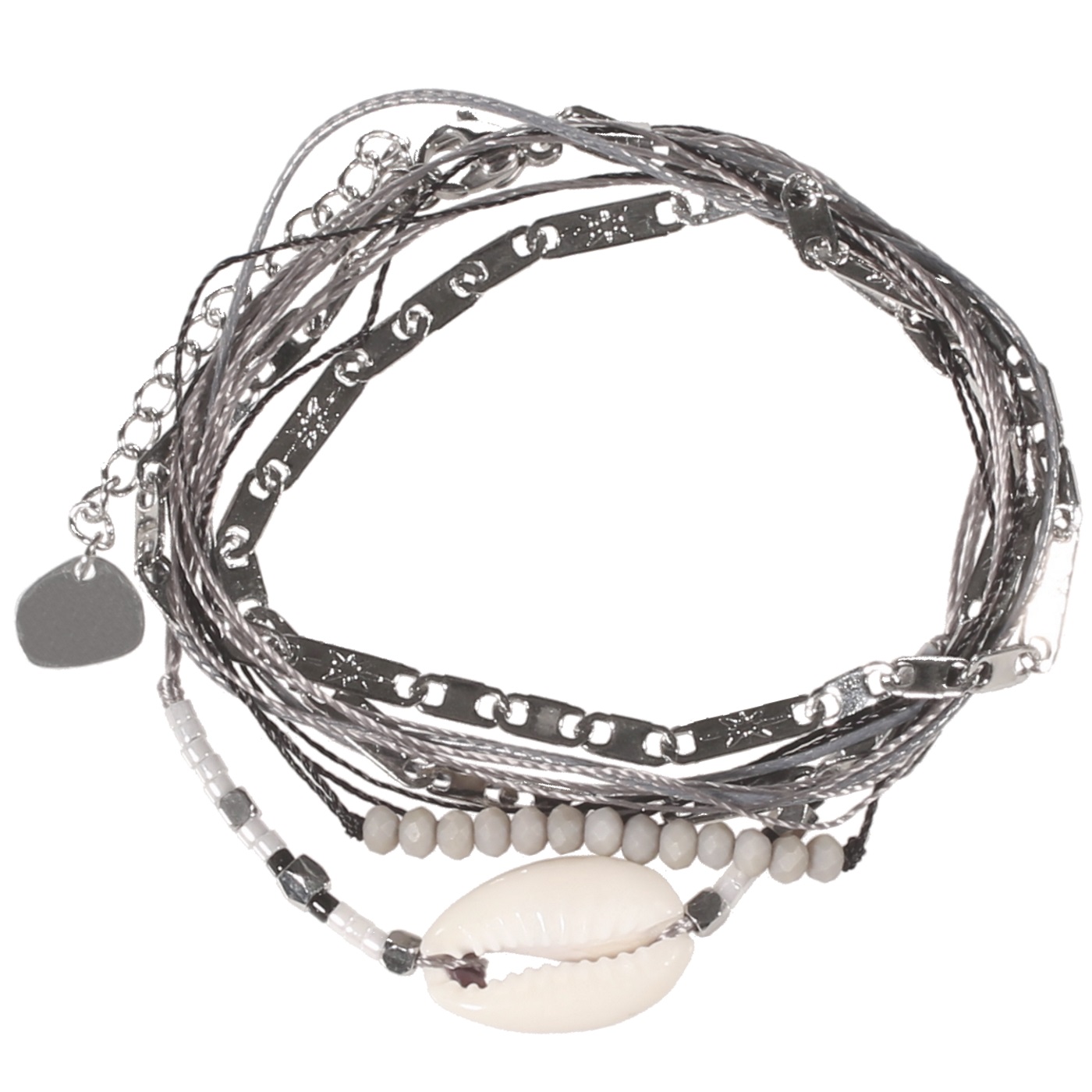 Bracelet en acier, pierres synthétiques, coquillage et textile.