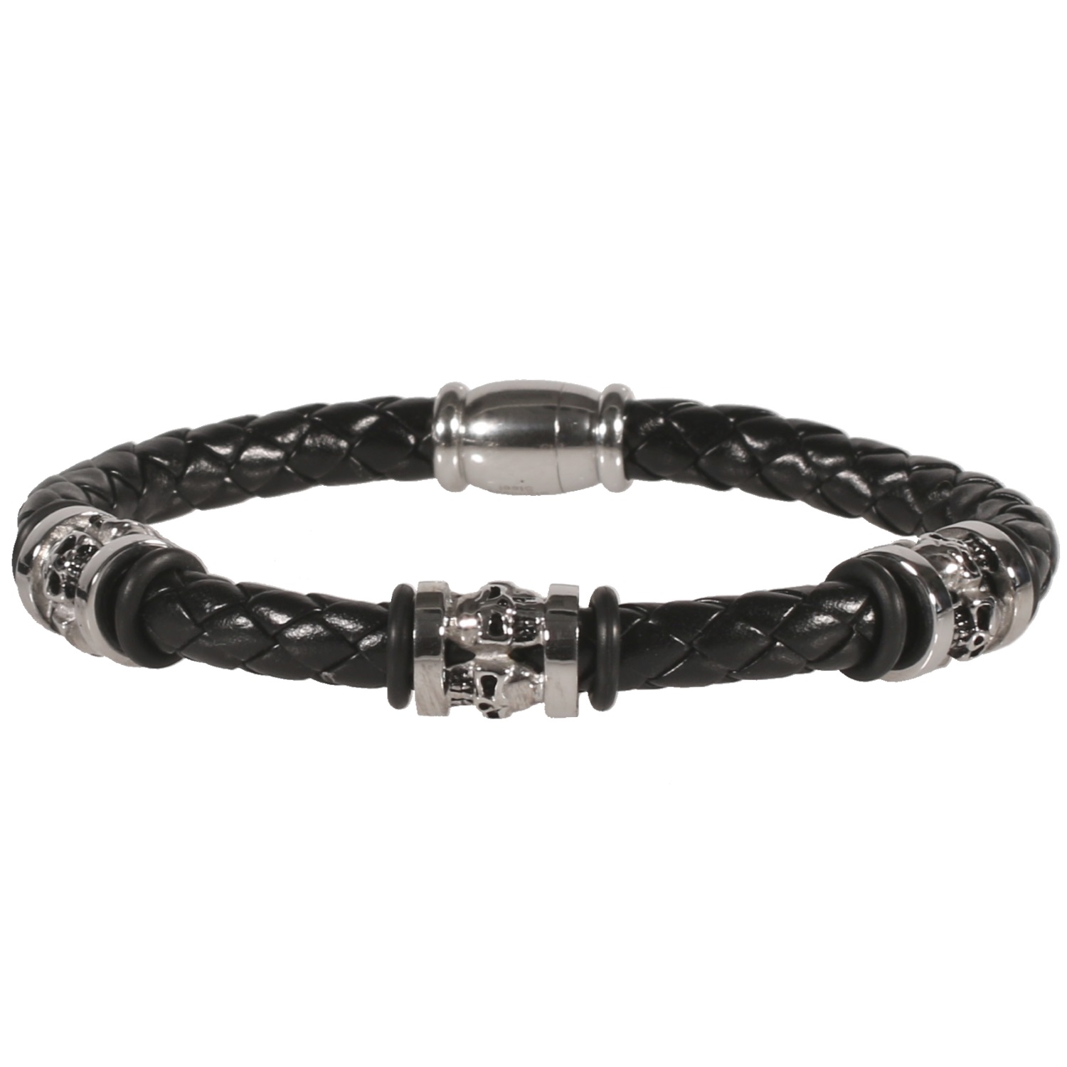 Bracelet pour homme avec têtes de mort en cuir noir et acier argenté.