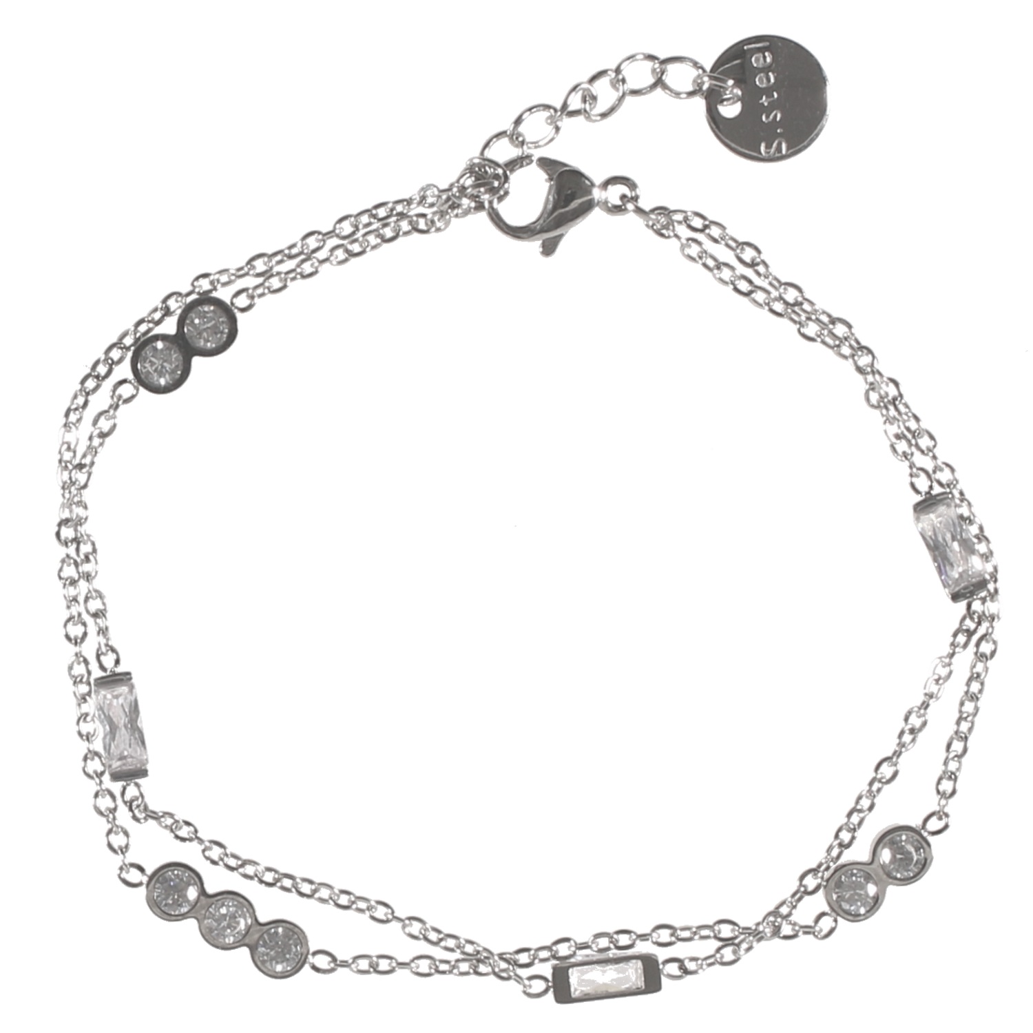 Description Bracelet multi rangs en acier argenté et cristaux en verre. 2 rangs. Longueur 16+2 cm [Guide des tailles] Largeur 5 mm Matière(s) Acier , Verre . L'acier utilisé dans la bijouterie existe sous plusieurs qualités. Nous utilisons principalement la qualité 316L, qualité qui est utilisée en chirurgie. Cet acier est donc inoxydable et reste très résistant. Fermoir Mousqueton Couleur(s) dominante(s) Argenté Public Adolescent , Adulte . Genre Femme , Fille . Saison Indémodable . Cliquez sur une matière, un thème, une couleur ou une collection pour voir tous les articles associés.