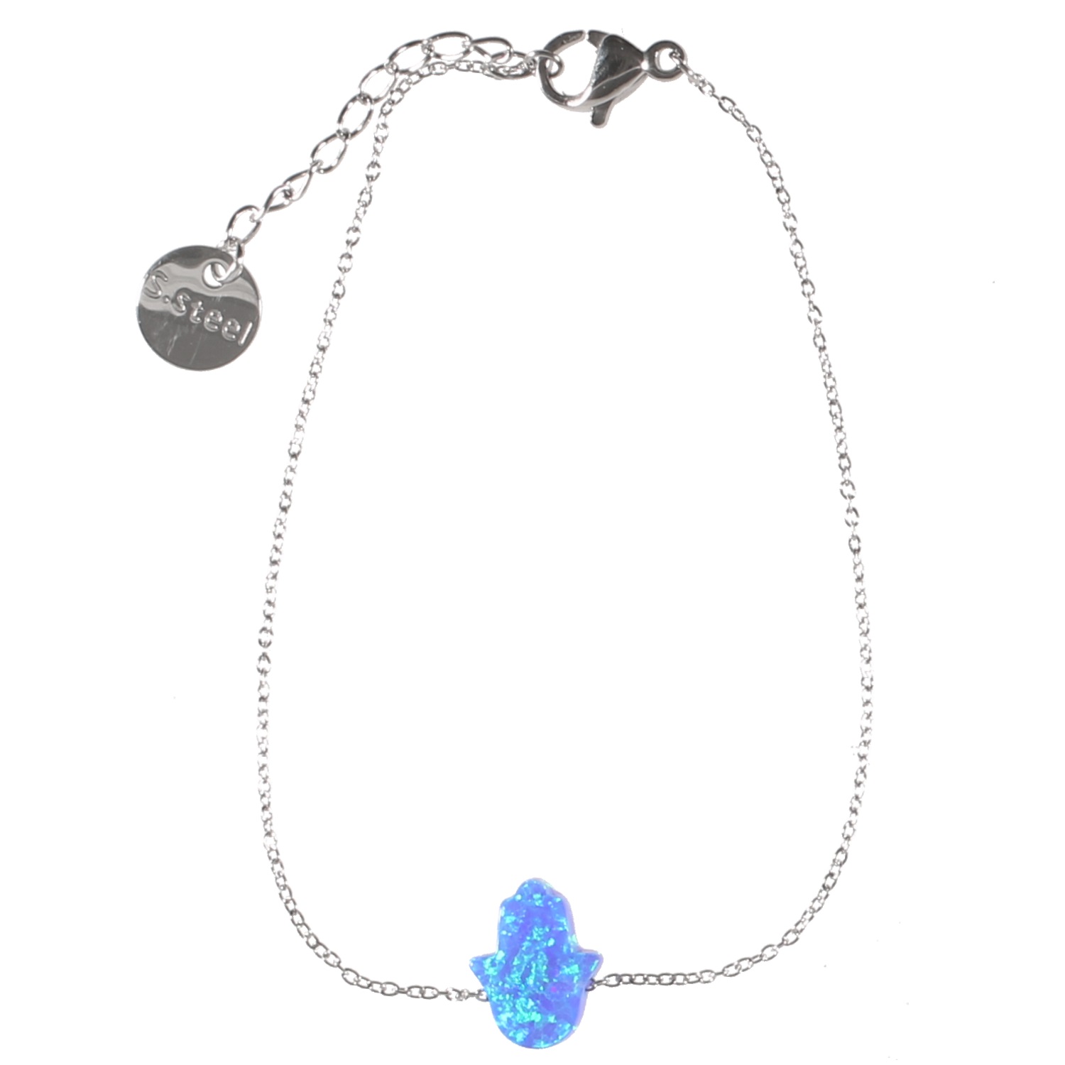 Bracelet en acier et main de Fatma en pierre semi précieuse opale bleue.