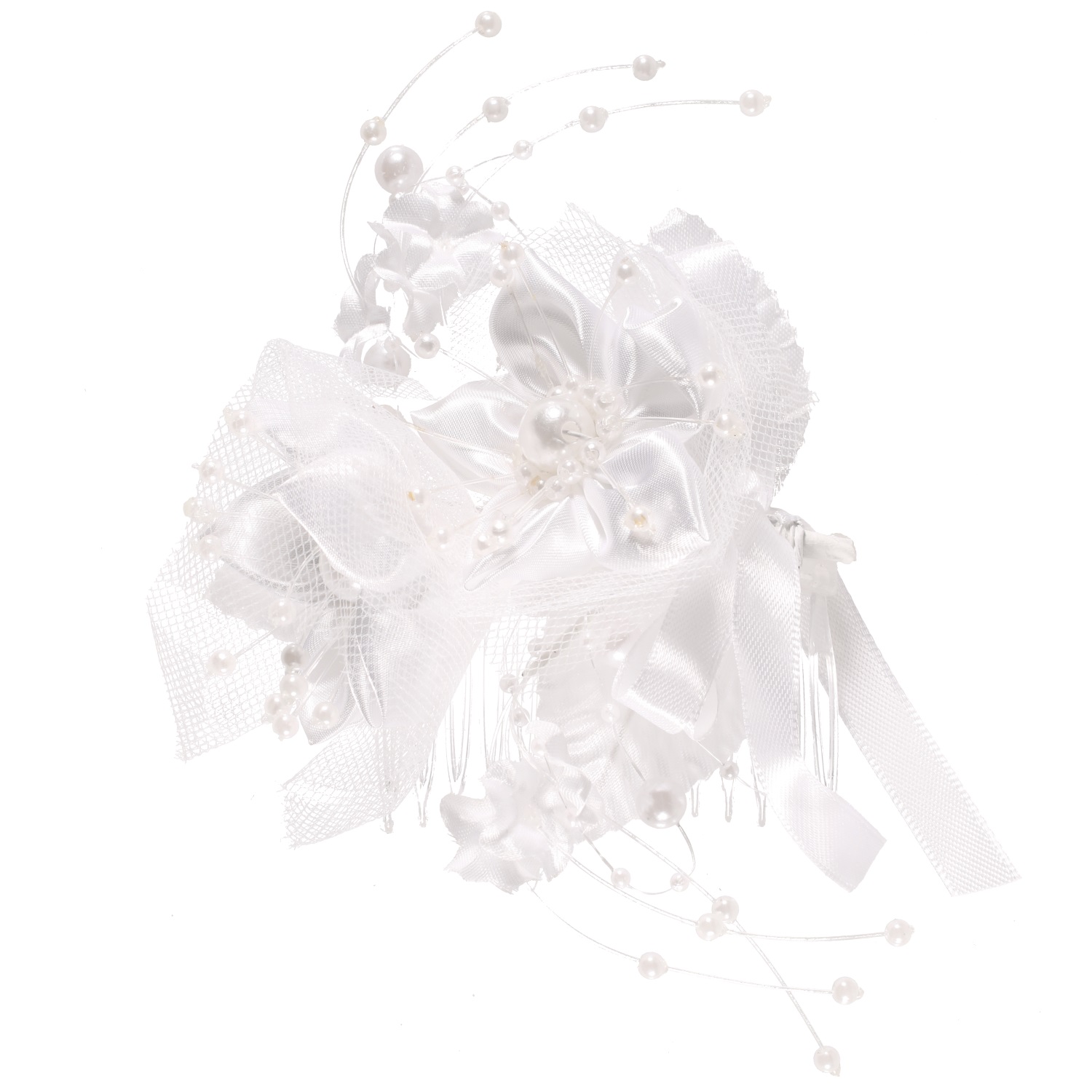 Peigne cheveux en plastique transparent avec fleurs en textile et perles synthétiques.