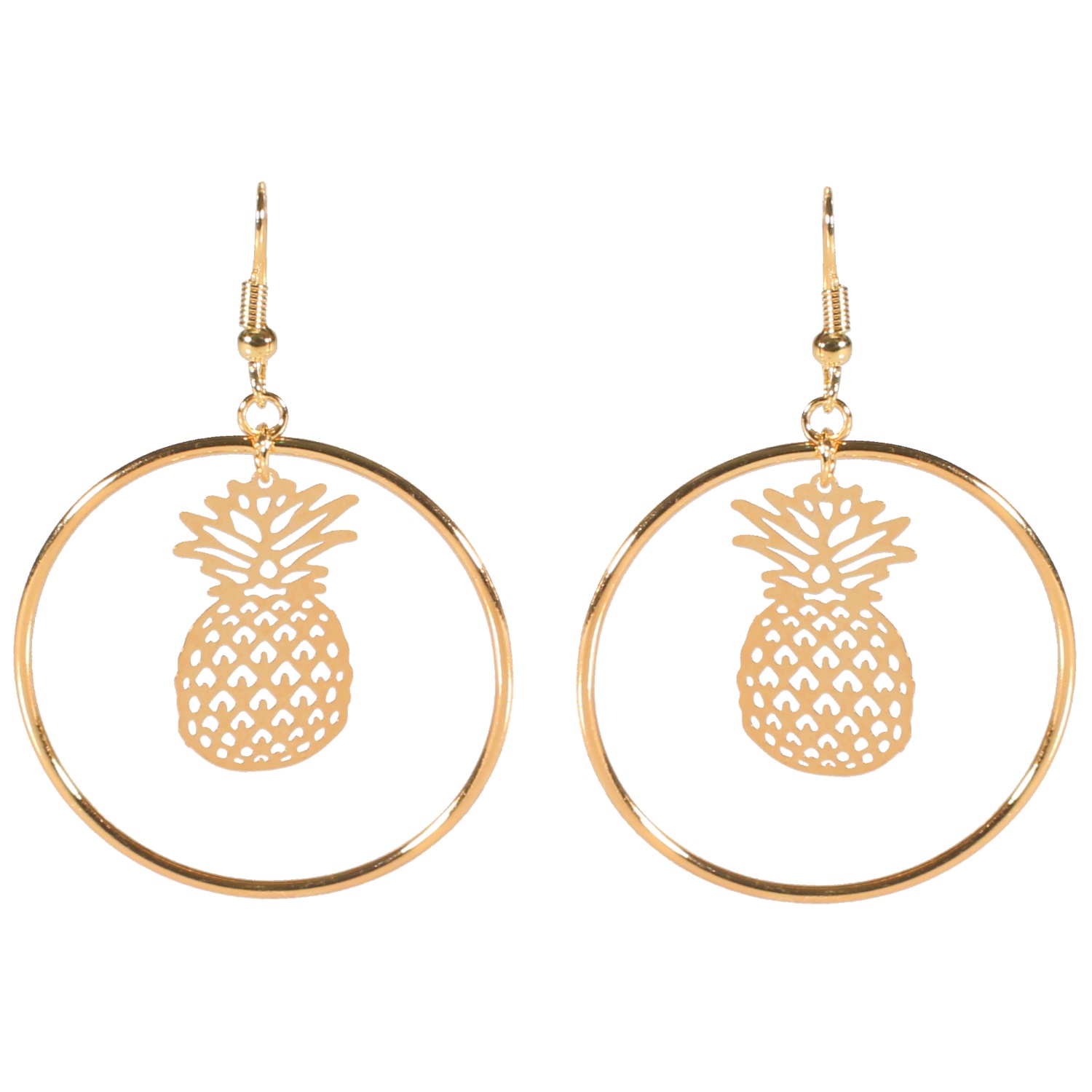Boucles d'oreilles pendantes ananas dans cercle en métal doré.