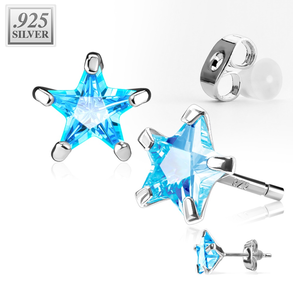 Boucles d'oreilles étoiles en argent 925/000 rhodié serties d'un oxyde de zirconium de couleur bleue.