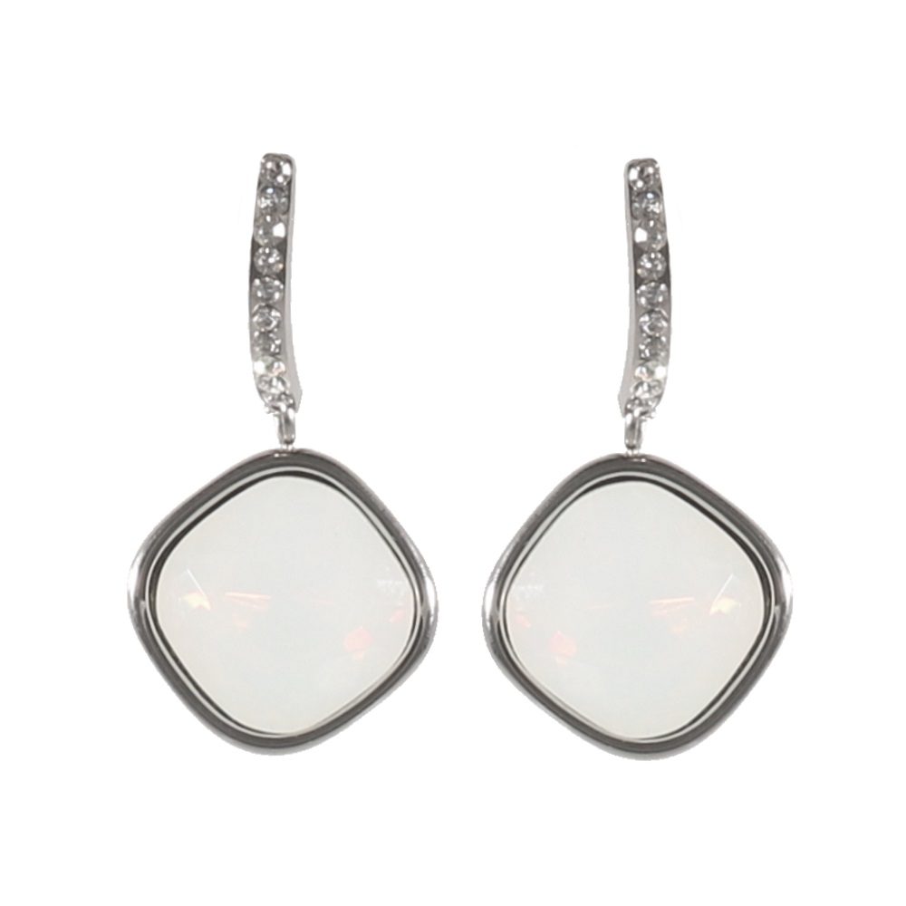 Boucles d'oreilles pendantes en acier argenté, strass et pierres de couleur.