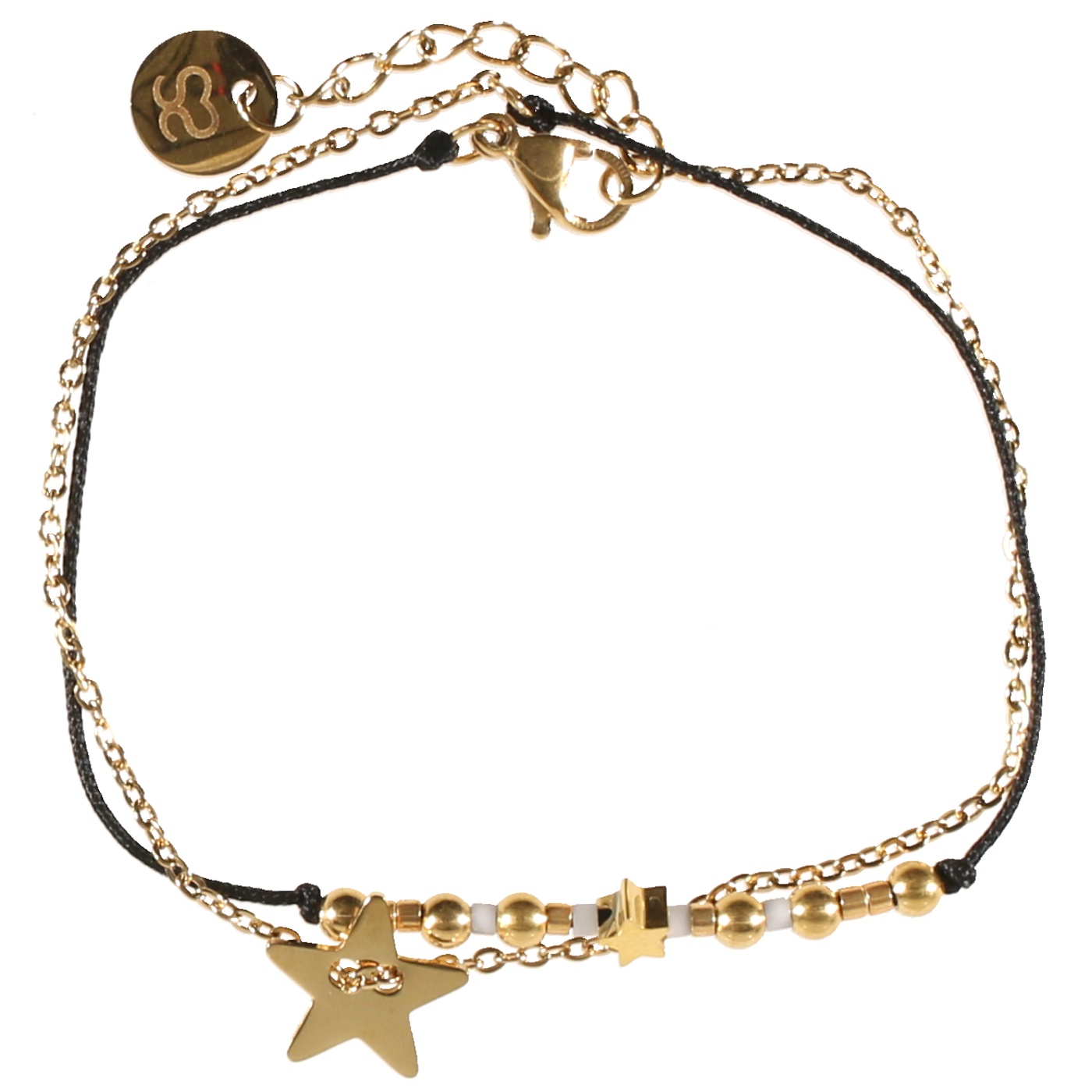 Bracelet deux tours avec étoiles en acier doré, cordon en coton et perles de couleurs.