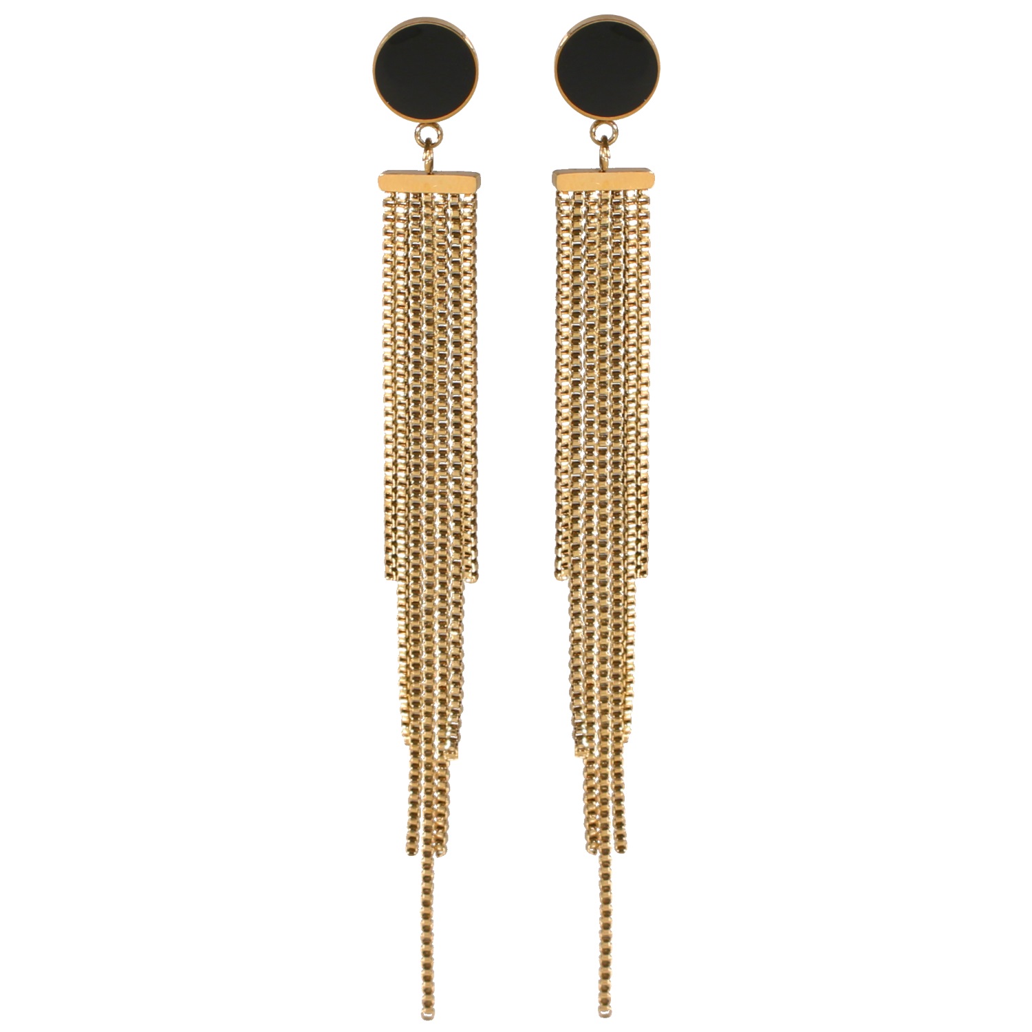 Description Boucles d'oreilles pendantes avec franges en acier doré et émail. Largeur 9 mm Hauteur 90 mm Matière(s) Acier , Email . L'acier utilisé dans la bijouterie existe sous plusieurs qualités. Nous utilisons principalement la qualité 316L, qualité qui est utilisée en chirurgie. Cet acier est donc inoxydable et reste très résistant. Fermoir Tiges poussettes Couleur(s) dominante(s) Doré , Noir Public Adolescent , Adulte . Genre Femme , Fille . Saison Indémodable . Cliquez sur une matière, un thème, une couleur ou une collection pour voir tous les articles associés.