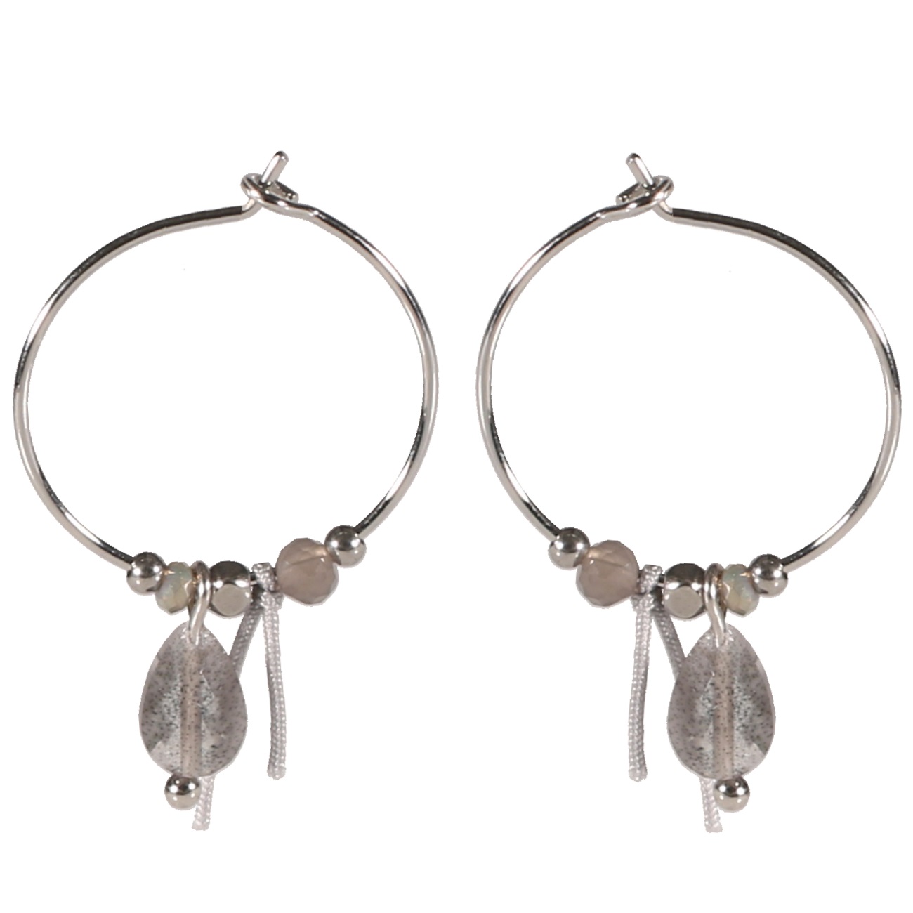 Boucles d'oreilles créoles avec pendants en acier argenté, petits cordons en coton et pierres de couleur.