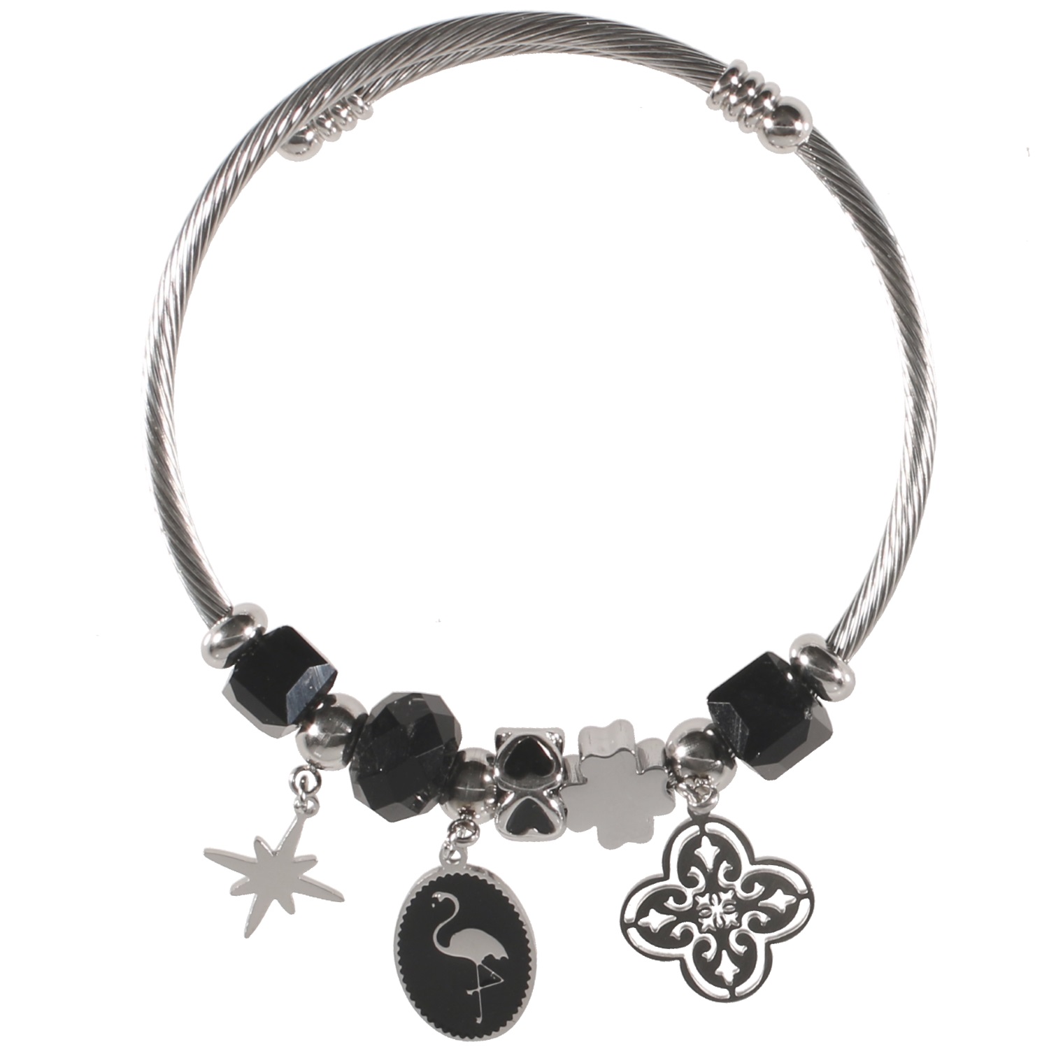 Bracelet charms avec breloques étoile, flamant en acier argenté, émail et pierres de couleur.