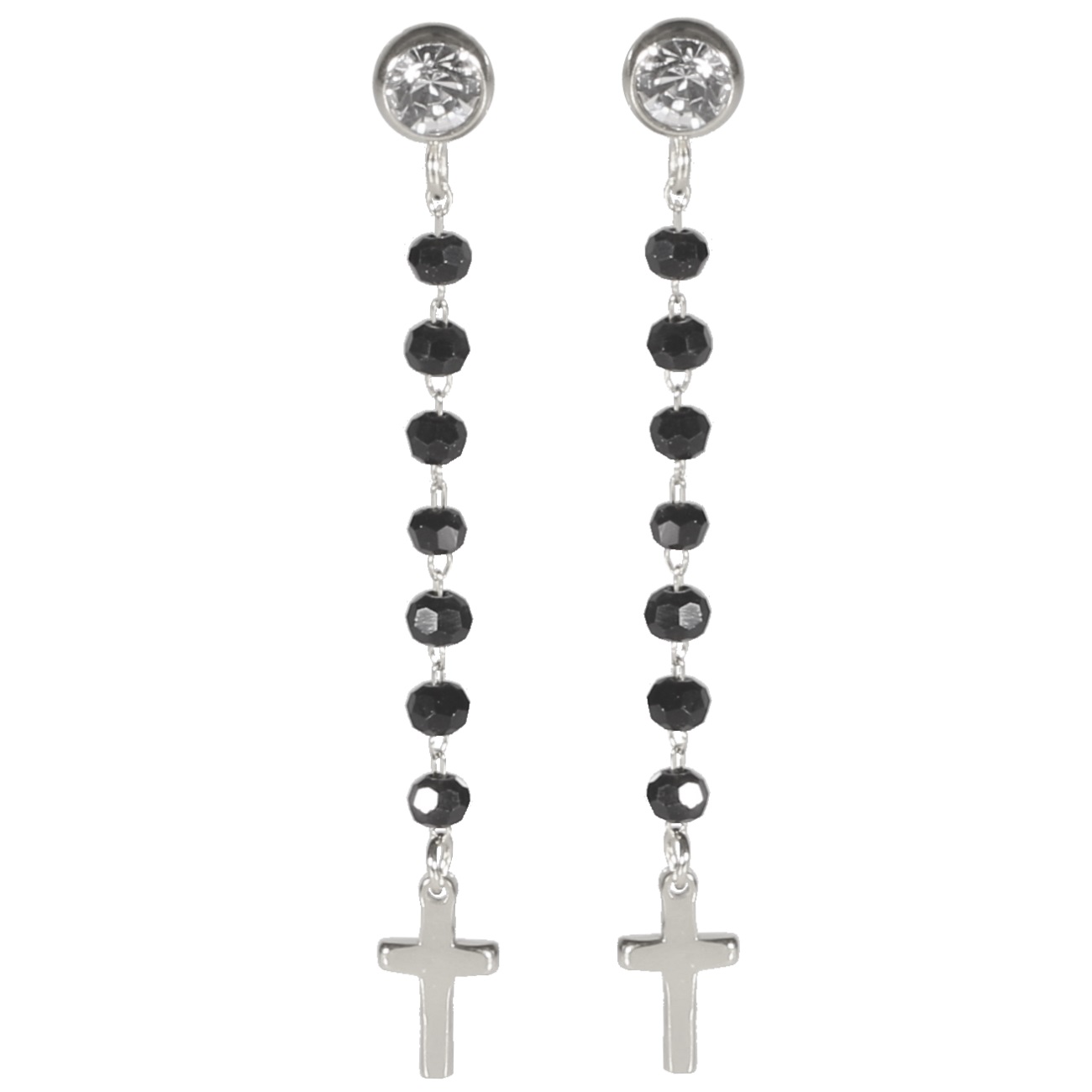 Boucles d'oreilles pendantes avec croix en acier argenté, perles de couleur et cristaux sertis clos.