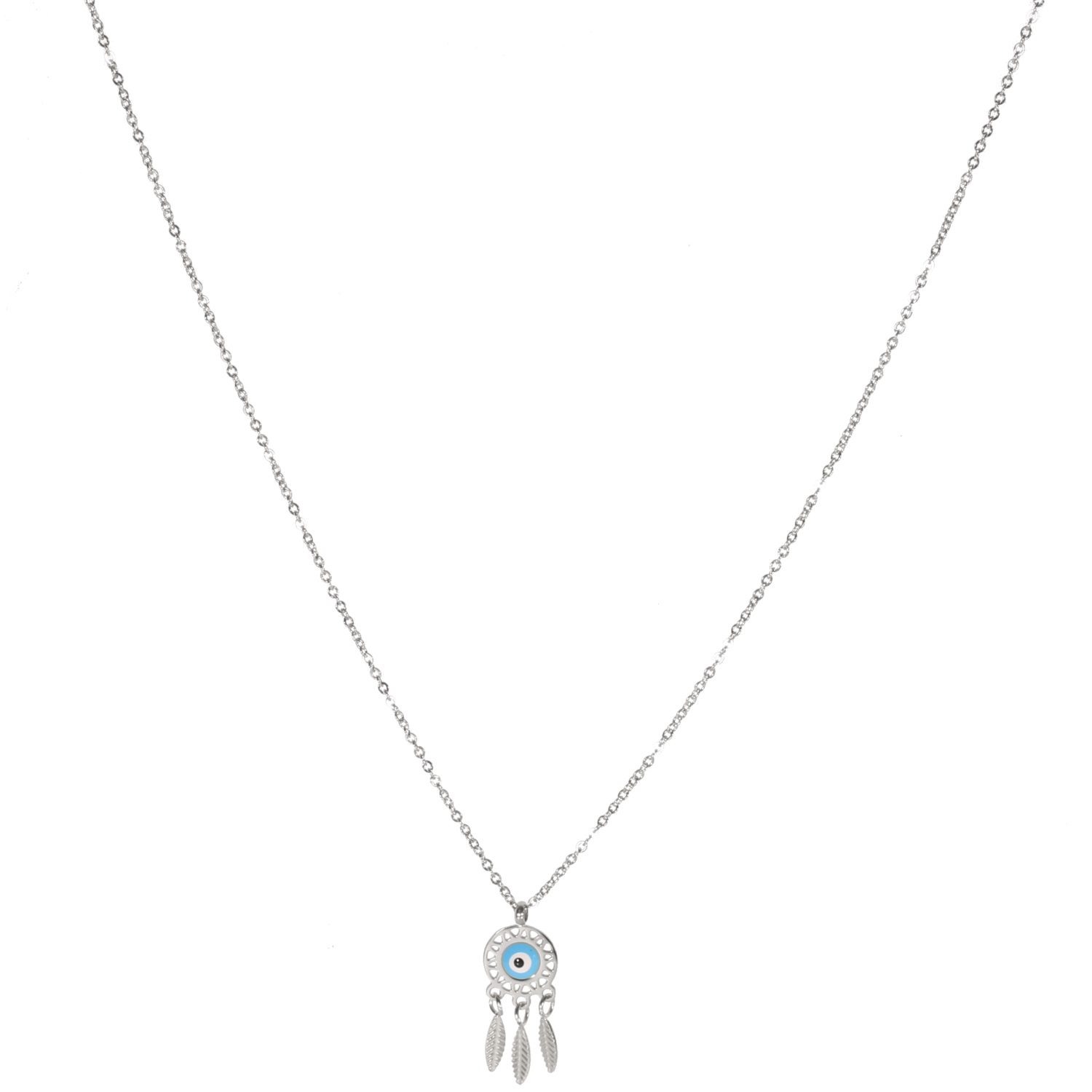 Collier avec pendentif attrape rêve en acier argenté et œil de Turquie en émail.
