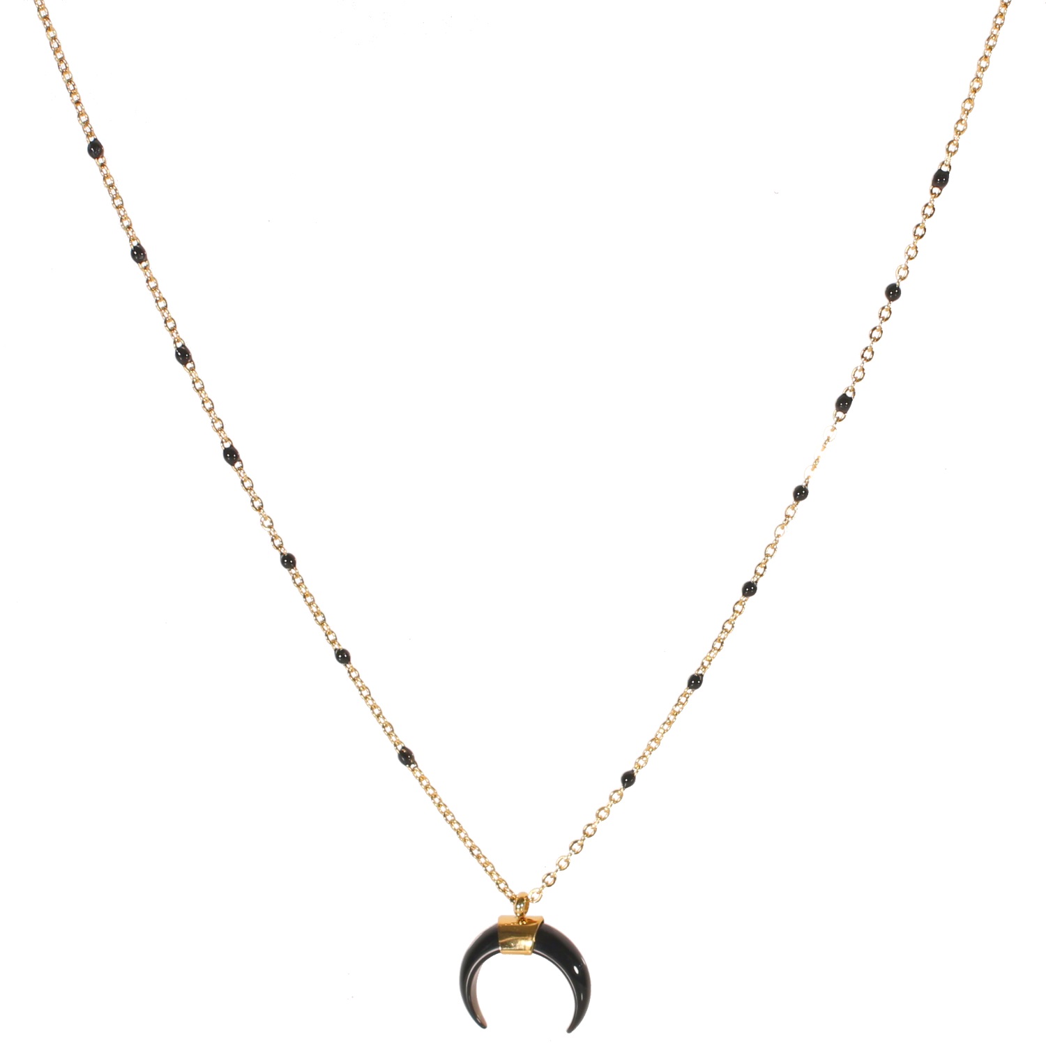 Description Collier avec pendentif en acier doré, perles en émail et croissant en résine de couleur noire. Cliquez sur une matière, un thème, une couleur ou une collection pour voir tous les articles associés.