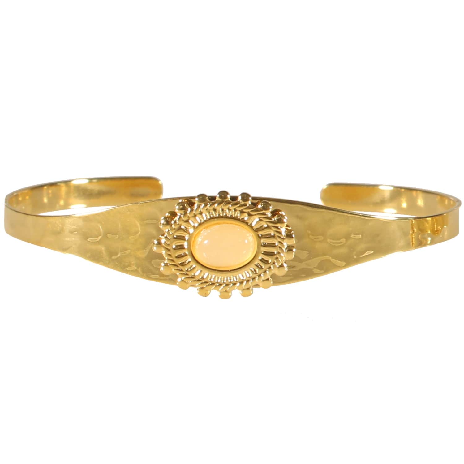 Description Bracelet jonc rigide ouvert effet martelé et pierre ovale de couleur blanche. Largeur 14 mm Diamètre 58 mm [Guide des tailles] Matière(s) Acier , Rocaille . L'acier utilisé dans la bijouterie existe sous plusieurs qualités. Nous utilisons principalement la qualité 316L, qualité qui est utilisée en chirurgie. Cet acier est donc inoxydable et reste très résistant. Fermoir Aucun Couleur(s) dominante(s) Blanc , Doré Public Adolescent , Adulte . Genre Femme , Fille . Saison Indémodable . Cliquez sur une matière, un thème, une couleur ou une collection pour voir tous les articles associés.