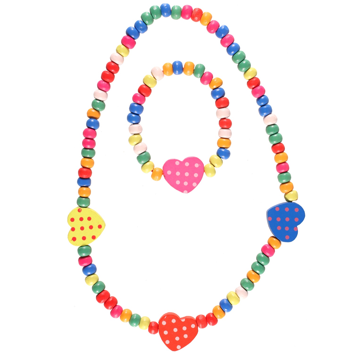 Parure pour enfants composée d'un collier et bracelet élastiques avec perles cœur en bois de couleur.
