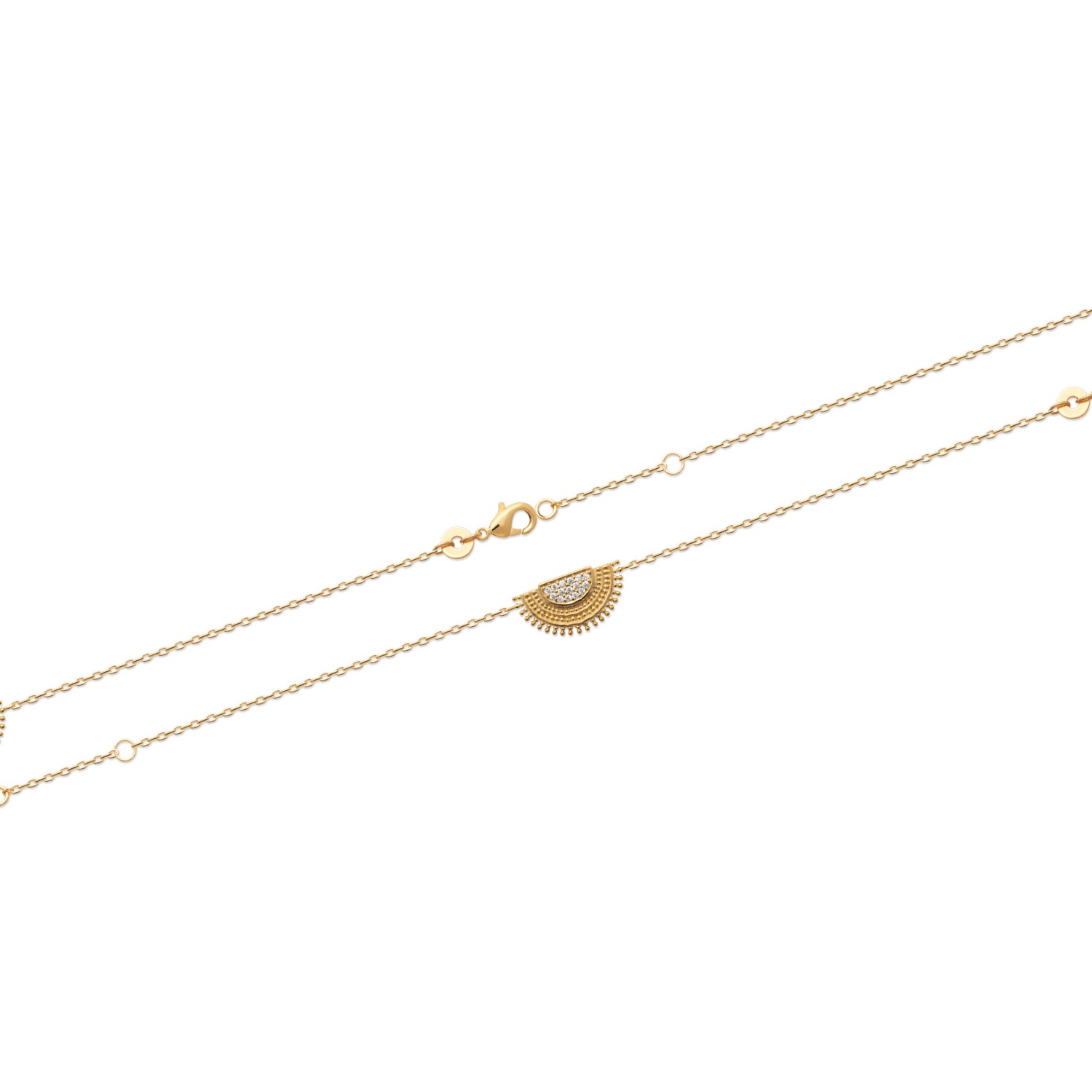 Description Bracelet surmonté d'un demi rond au contour en relief en plaqué or 18 carats serti d'oxydes de zirconium. Fermoir mousqueton avec anneaux de rappel à 16 et 18 cm. Longueur 16/18 cm [Guide des tailles] Largeur 9 mm Matière(s) Plaqué or , Zirconium . Nos bijoux en plaqué or sont faits sur une base de laiton et recouverts d'or 18 carats à 3 microns sans dispersion. Cela signifie que nous garantissons 3 microns d'or sur n'importe quelle partie du bijou. Sur la plupart de nos bijoux empierrés, nous montons à 5 microns d'or 18 carats. Pour finir, nous faisons également une finition avec de l'or 24 carats afin de donner un plus bel éclat à nos bijoux. Fermoir Mousqueton Couleur(s) dominante(s) Doré Public Adolescent , Adulte . Genre Femme , Fille . Saison Indémodable . Cliquez sur une matière, un thème, une couleur ou une collection pour voir tous les articles associés.