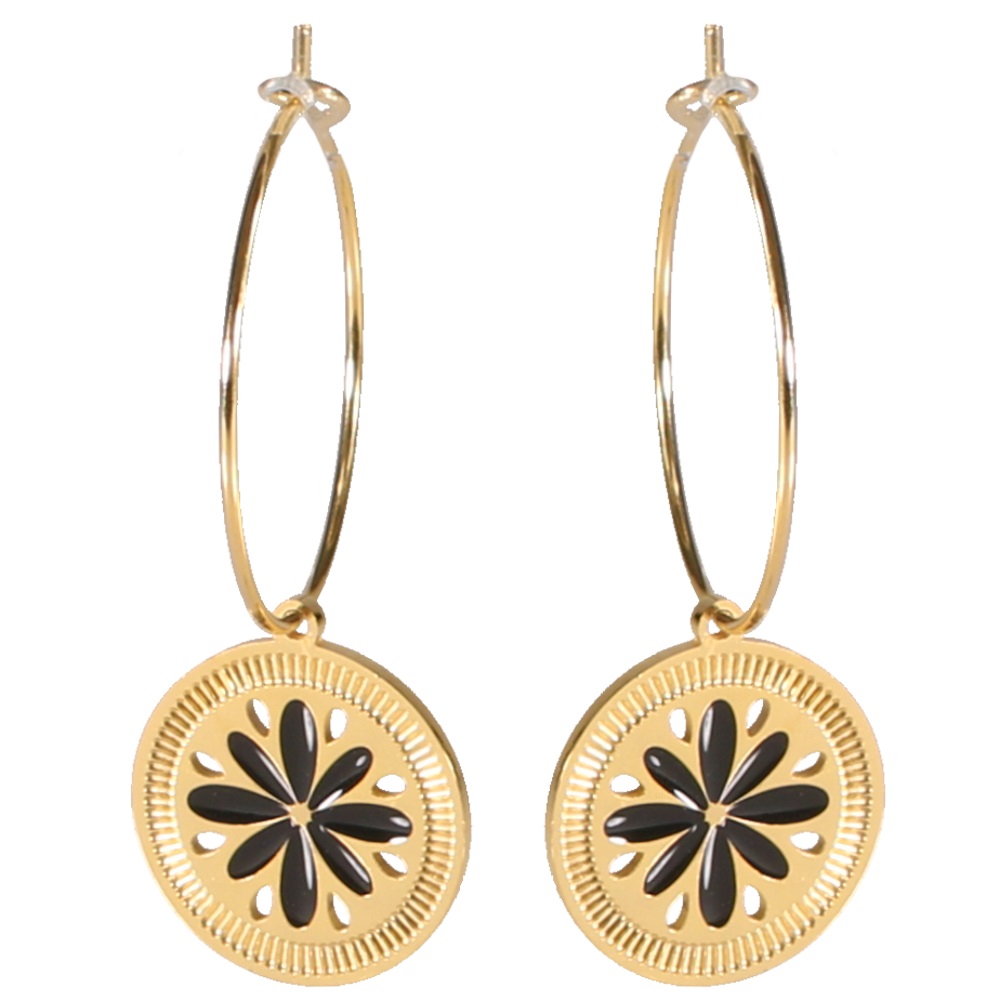 Boucles d'oreilles créoles avec pendants ronds au motif de fleurs en acier doré et émail de couleur noire.