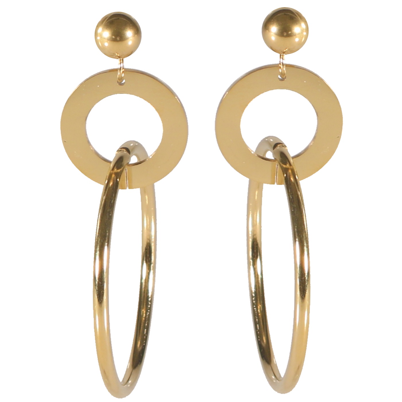 Description Boucles d'oreilles pendantes composées d'une puce boule et de double cercles en acier doré. Largeur 33 mm Hauteur 50 mm Matière(s) Acier . L'acier utilisé dans la bijouterie existe sous plusieurs qualités. Nous utilisons principalement la qualité 316L, qualité qui est utilisée en chirurgie. Cet acier est donc inoxydable et reste très résistant. Fermoir Tiges poussettes Couleur(s) dominante(s) Doré Public Adolescent , Adulte . Genre Femme , Fille . Saison Indémodable . Cliquez sur une matière, un thème, une couleur ou une collection pour voir tous les articles associés.