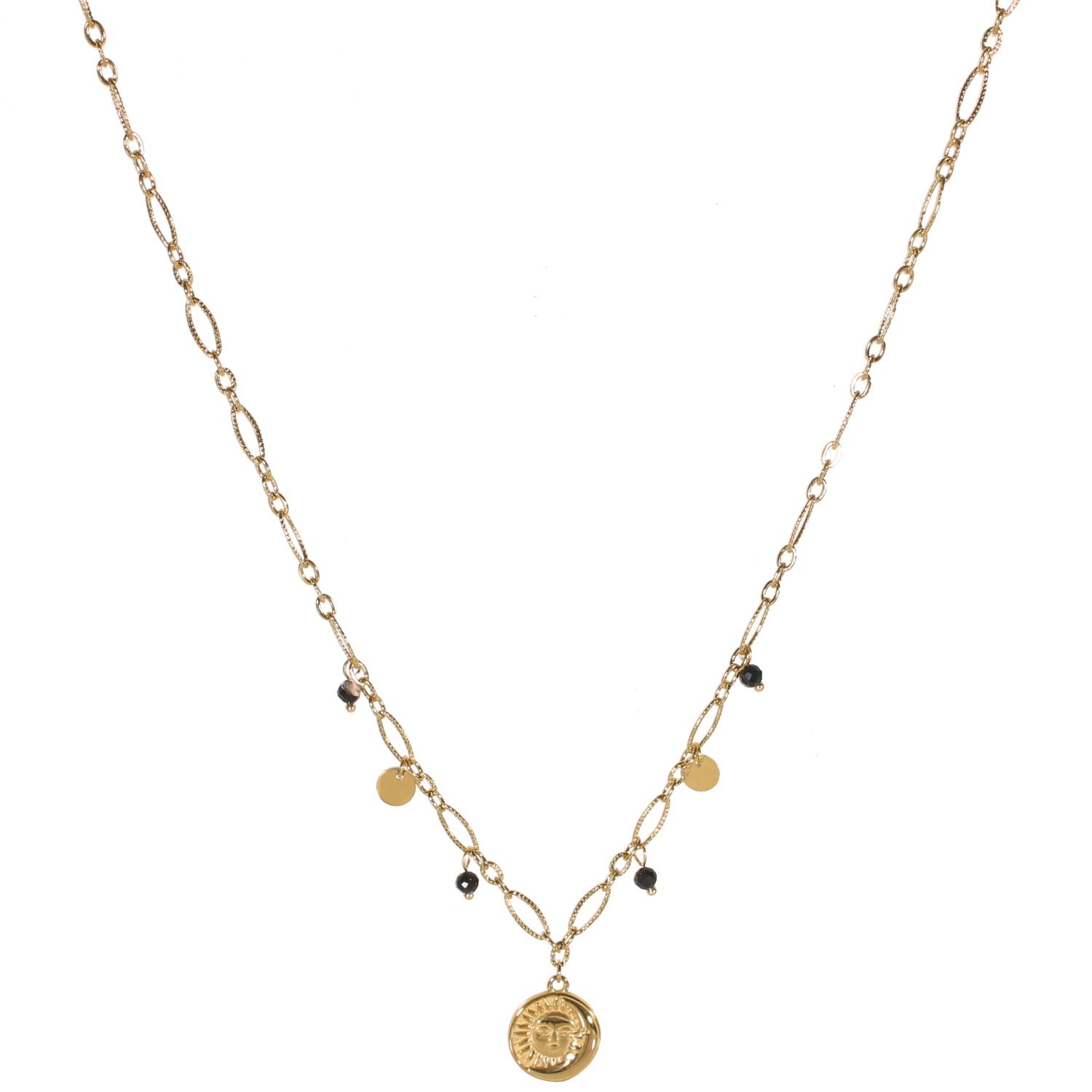 Description Collier composé d'une chaîne avec deux pampilles rondes et un pendentif rond au motif du soleil et de la lune en acier doré ainsi que de quatre perles de couleur noire. Fermoir mousqueton avec 6 cm de rallonge. Cliquez sur une matière, un thème, une couleur ou une collection pour voir tous les articles associés.