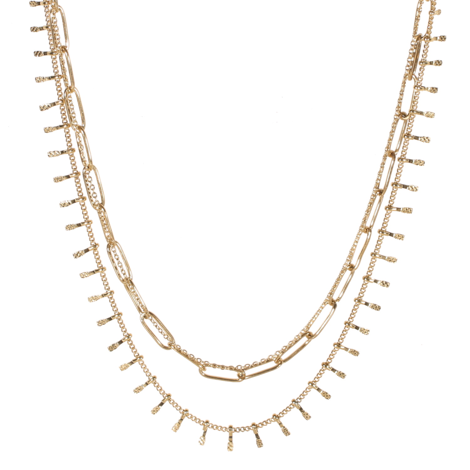 Description Collier triple rangs composé d'une chaîne grosse maille de 38 cm de long en acier doré, une chaîne de 39 cm de long en acier doré, ainsi qu'une chaîne de 40 cm de long avec pampilles en acier doré. Fermoir mousqueton avec une rallonge de 6 cm. Longueur 38+6 cm [Guide des tailles] Matière(s) Acier . L'acier utilisé dans la bijouterie existe sous plusieurs qualités. Nous utilisons principalement la qualité 316L, qualité qui est utilisée en chirurgie. Cet acier est donc inoxydable et reste très résistant. Fermoir Mousqueton Couleur(s) dominante(s) Doré Public Adolescent , Adulte . Genre Femme , Fille . Saison Indémodable . Collection Myriade Cliquez sur une matière, un thème, une couleur ou une collection pour voir tous les articles associés.