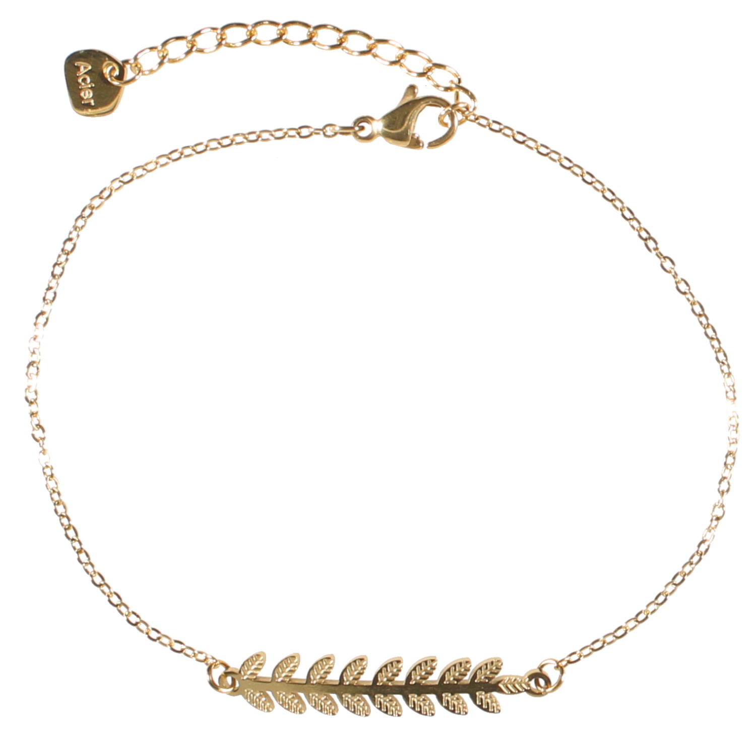 Description Bracelet composé d'une chaîne et d'une branche laurier en acier doré. Fermoir mousqueton avec 3 cm de rallonge. Cliquez sur une matière, un thème, une couleur ou une collection pour voir tous les articles associés.