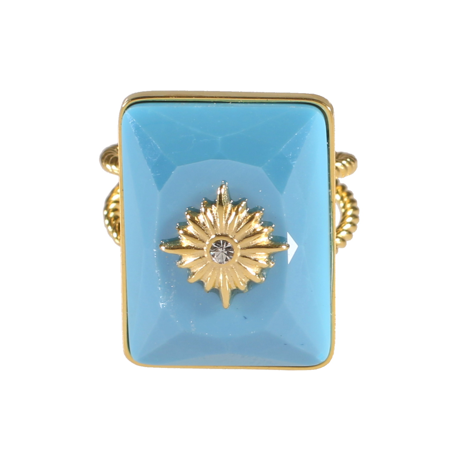 Bague en acier doré surmontée d'une pierre de couleur turquoise sertie clos de forme rectangulaire avec une étoile en acier doré sertie d'un cristal.