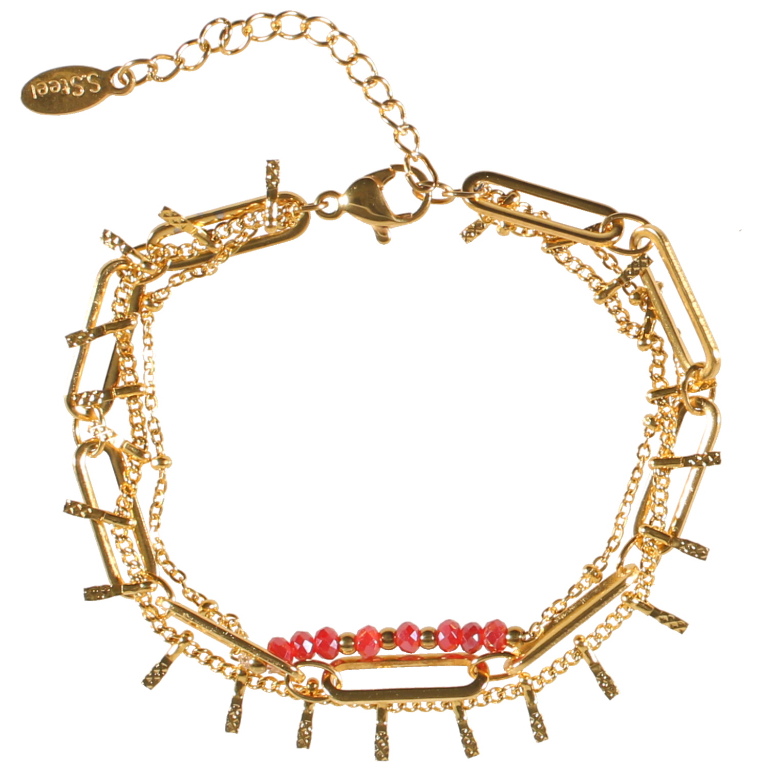Bracelet triple rangs composé d'une chaîne en acier doré, une chaîne avec pampilles en acier doré et une chaîne en acier doré surmontée de perles en pierre de couleur rouge.