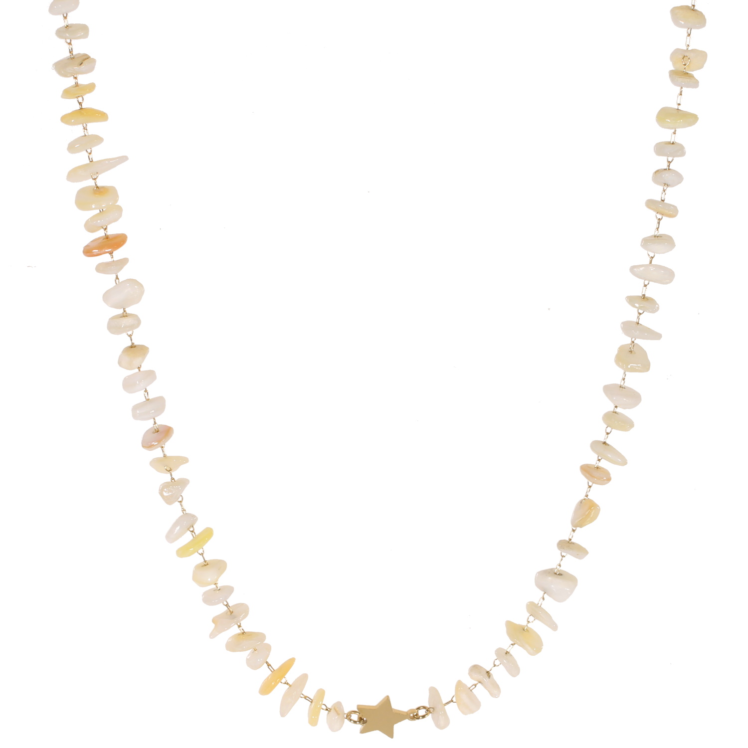 Description Collier avec pendentif étoile en acier doré surmonté de coquilles de nacre. Fermoir mousqueton avec 7 cm de rallonge. Longueur 37+7 cm [Guide des tailles] Largeur 10 mm Matière(s) Acier , Nacre . L'acier utilisé dans la bijouterie existe sous plusieurs qualités. Nous utilisons principalement la qualité 316L, qualité qui est utilisée en chirurgie. Cet acier est donc inoxydable et reste très résistant. Fermoir Mousqueton Couleur(s) dominante(s) Blanc , Doré Public Adolescent , Adulte . Genre Femme , Fille . Saison Eté . Thème(s) Nature . Collection Seaside Cliquez sur une matière, un thème, une couleur ou une collection pour voir tous les articles associés.
