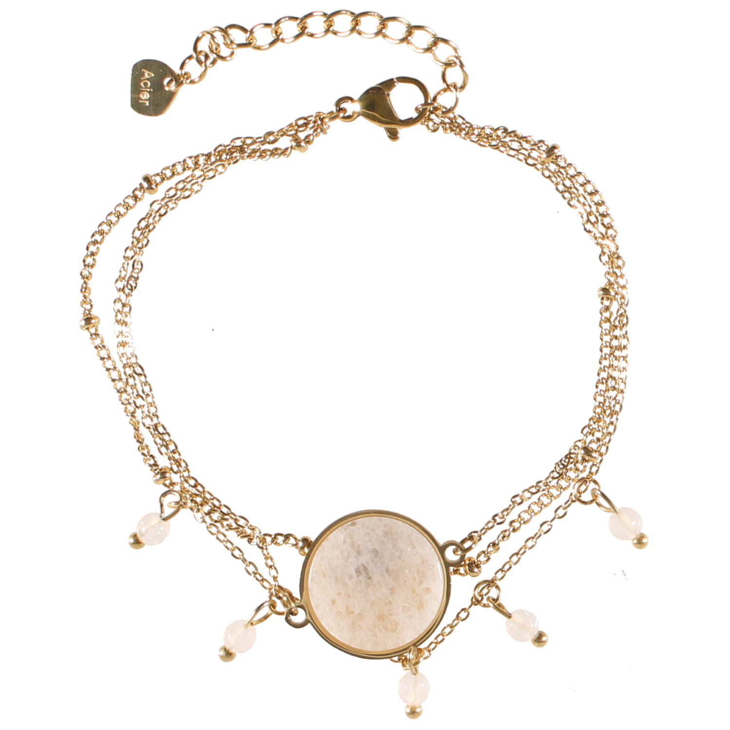 Bracelet triple rangs composé d'une chaîne en acier doré, une chaîne en acier doré avec 5 perles en véritable pierre de jade blanc, ainsi qu'une chaîne en acier doré surmontée d'une pastille ronde pavée d'une véritable pierre de jade blanc.