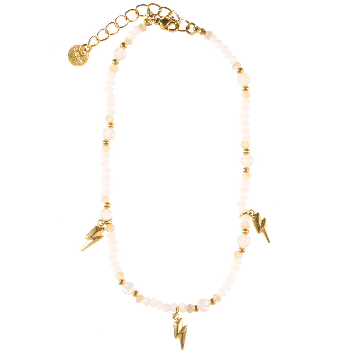 Bracelet chaîne de cheville composé de perles de couleur blanche et de trois éclairs en acier doré.