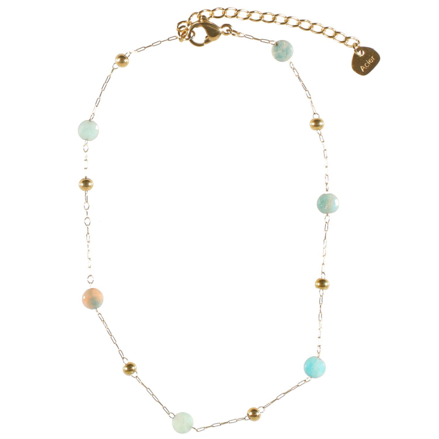 Bracelet chaîne de cheville composé d'une chaîne avec perles en acier doré et de perles en véritable pierre d'amazonite.