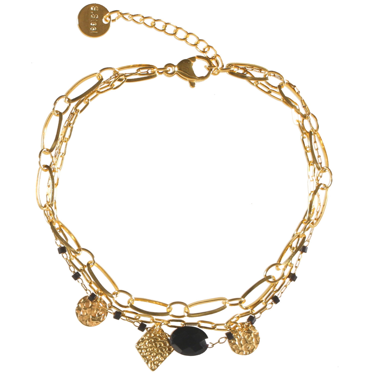 Description Bracelet triple rangs composé d'une chaîne en acier doré avec perles cylindriques de couleur noire et une pierre ovale de couleur noire, une chaîne en acier doré, ainsi qu'une chaîne avec pampilles rondes et en losange martelées en acier doré. Fermoir mousqueton avec 3 cm de rallonge. Longueur 17+3 cm [Guide des tailles] Largeur 10 mm Matière(s) Acier , Rocaille . L'acier utilisé dans la bijouterie existe sous plusieurs qualités. Nous utilisons principalement la qualité 316L, qualité qui est utilisée en chirurgie. Cet acier est donc inoxydable et reste très résistant. Fermoir Mousqueton Couleur(s) dominante(s) Doré , Noir Public Adolescent , Adulte . Genre Femme , Fille . Saison Indémodable . Cliquez sur une matière, un thème, une couleur ou une collection pour voir tous les articles associés.