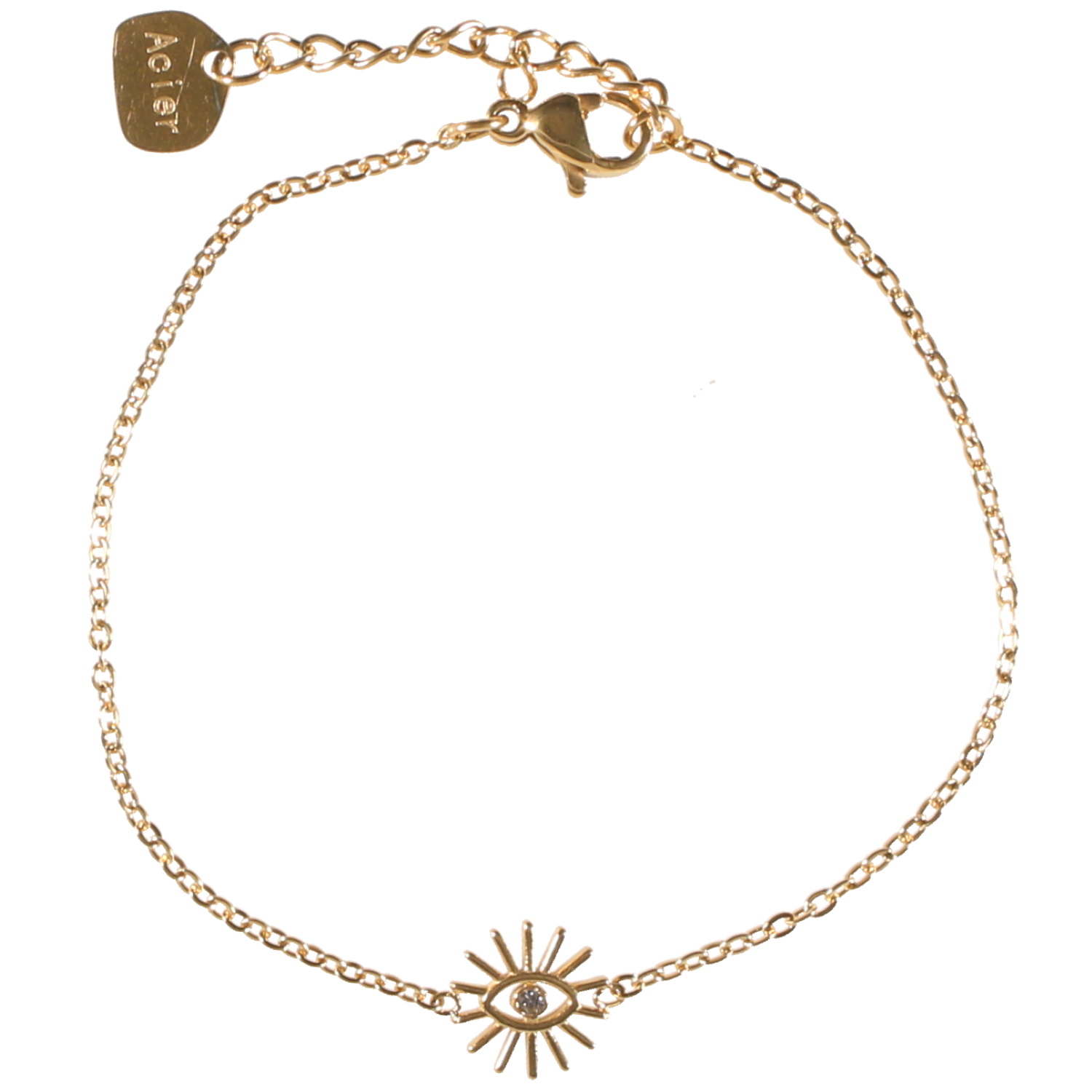 Bracelet composé d'une chaîne en acier doré et d'un œil de Turquie en acier doré serti d'un cristal.