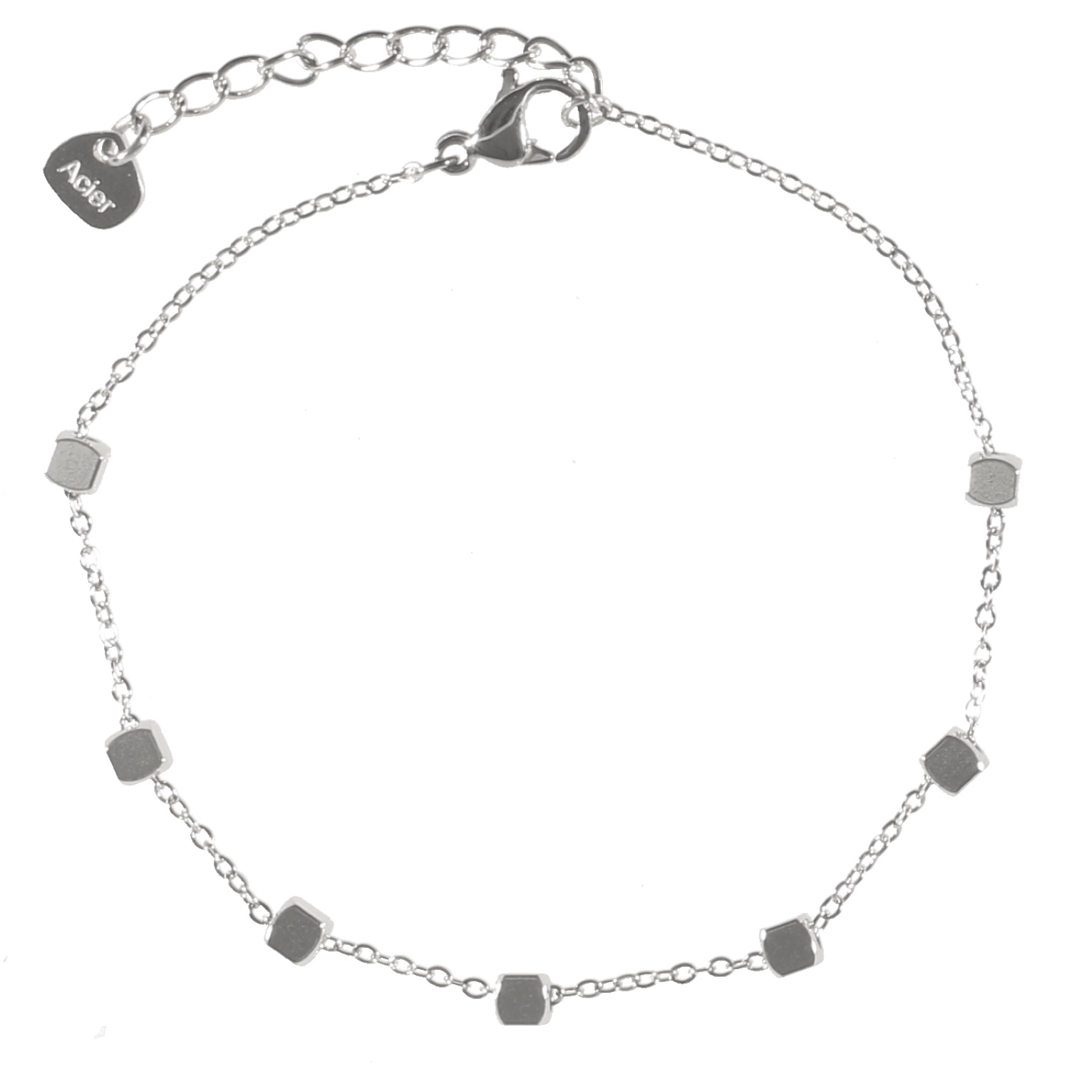 Description Bracelet composé d'une chaîne avec cubes en acier argenté. Fermoir mousqueton avec 3 cm de rallonge. Longueur 16+3 cm [Guide des tailles] Largeur 3 mm Matière(s) Acier . L'acier utilisé dans la bijouterie existe sous plusieurs qualités. Nous utilisons principalement la qualité 316L, qualité qui est utilisée en chirurgie. Cet acier est donc inoxydable et reste très résistant. Fermoir Mousqueton Couleur(s) dominante(s) Argenté Public Adolescent , Adulte . Genre Femme , Fille . Saison Indémodable . Cliquez sur une matière, un thème, une couleur ou une collection pour voir tous les articles associés.