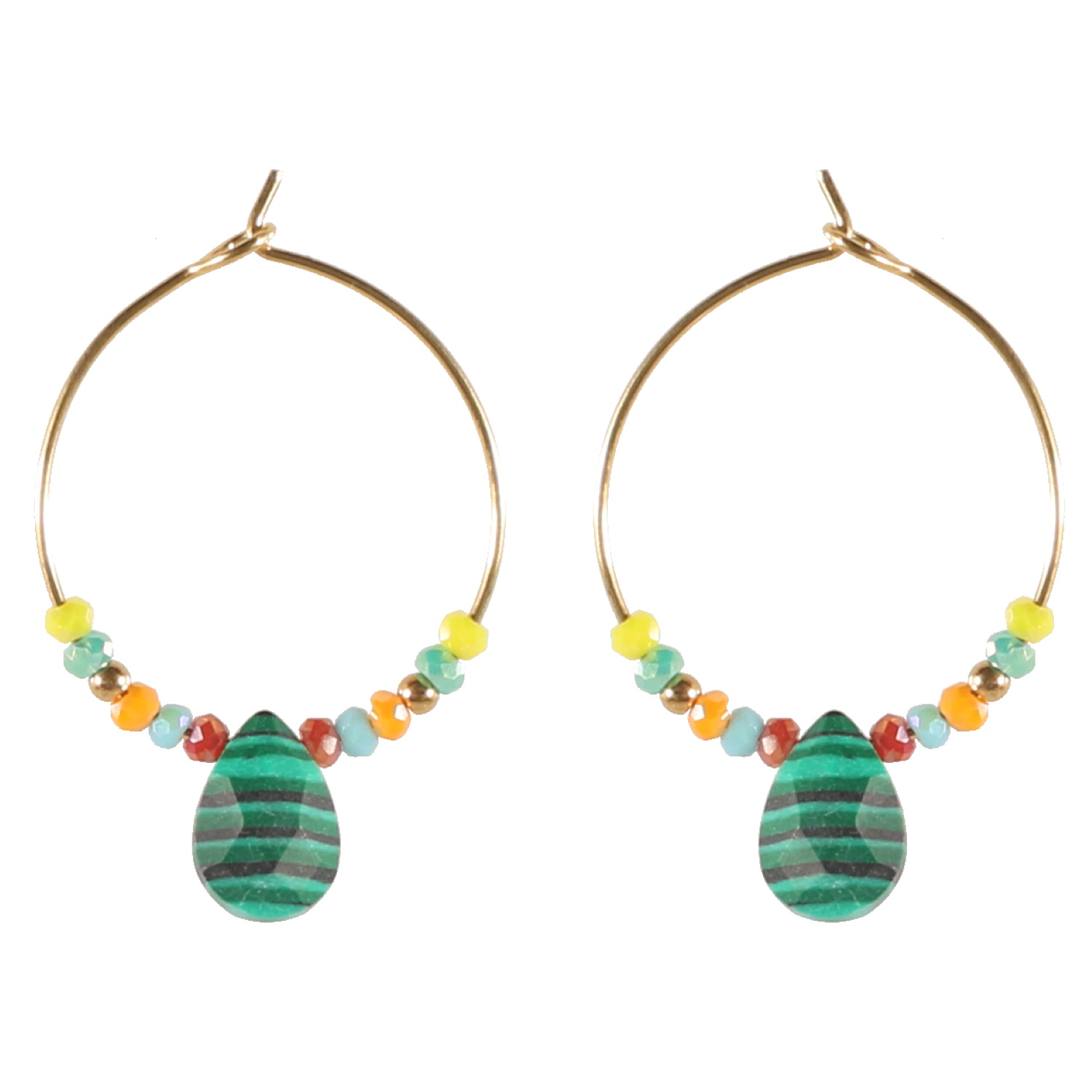 Boucles d'oreilles créoles en acier doré surmontées de perles multicolores et d'une pierre d'imitation malachite en forme de goutte.