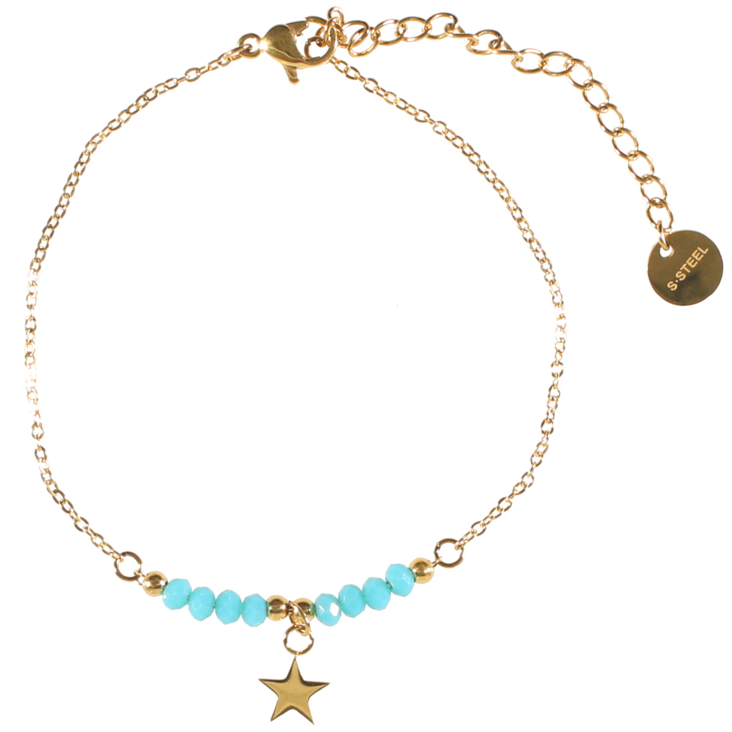 Description Bracelet composé d'une chaîne en acier doré, de perles de couleur turquoise et d'une étoile en acier doré. Fermoir mousqueton avec 5 cm de rallonge. Longueur 15+5 cm [Guide des tailles] Largeur 11 mm Matière(s) Acier , Rocaille . L'acier utilisé dans la bijouterie existe sous plusieurs qualités. Nous utilisons principalement la qualité 316L, qualité qui est utilisée en chirurgie. Cet acier est donc inoxydable et reste très résistant. Fermoir Mousqueton Couleur(s) dominante(s) Bleu , Doré Public Adolescent , Adulte . Genre Femme , Fille . Saison Indémodable . Thème(s) Nature . Cliquez sur une matière, un thème, une couleur ou une collection pour voir tous les articles associés.