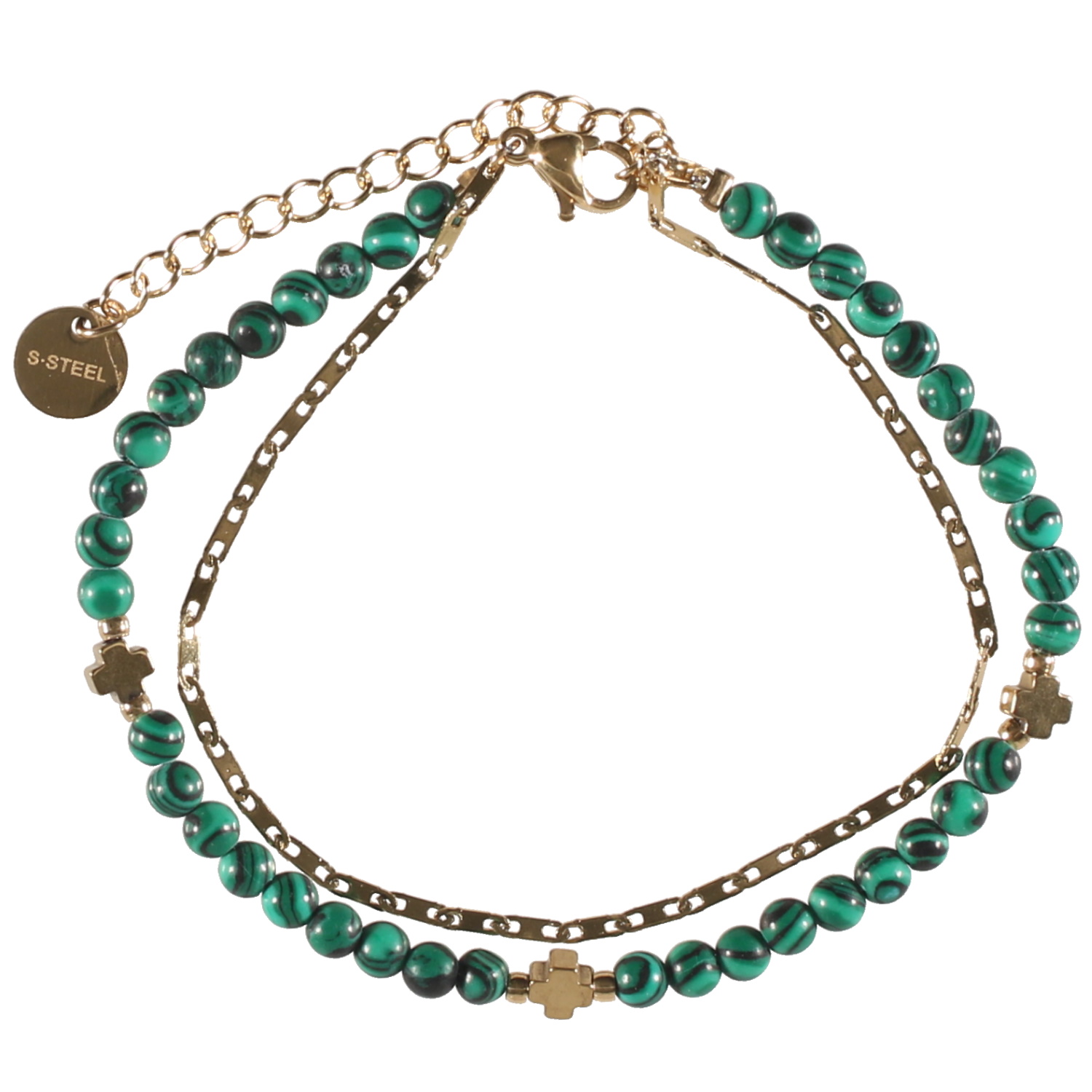 Bracelet double rangs composé d'une chaîne en acier doré, ainsi qu'un bracelet de perles d'imitation malachite et de trois croix en acier doré.