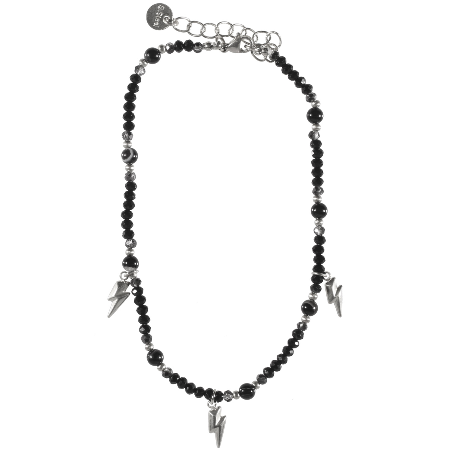 Description Bracelet chaîne de cheville composé de perles et pampilles éclairs en acier argenté et de perles de couleur noire. Fermoir mousqueton en acier doré avec 4 cm de rallonge. Cliquez sur une matière, un thème, une couleur ou une collection pour voir tous les articles associés.