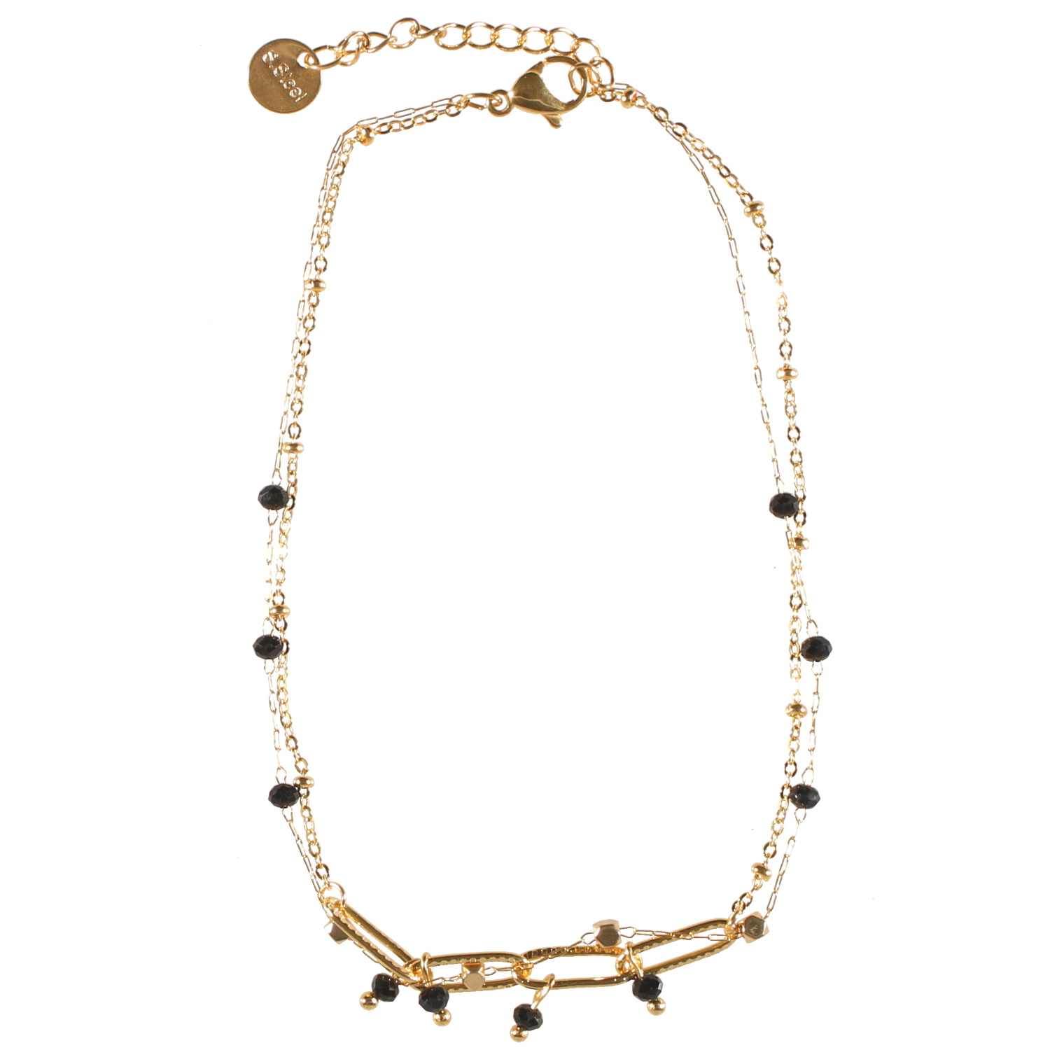 Description Bracelet chaîne de cheville double rangs composé d'une chaîne en acier doré avec pampilles de perles de couleur noire, ainsi qu'une chaîne en acier doré avec perles de couleur noire. Fermoir mousqueton avec 3 cm de rallonge. Cliquez sur une matière, un thème, une couleur ou une collection pour voir tous les articles associés.