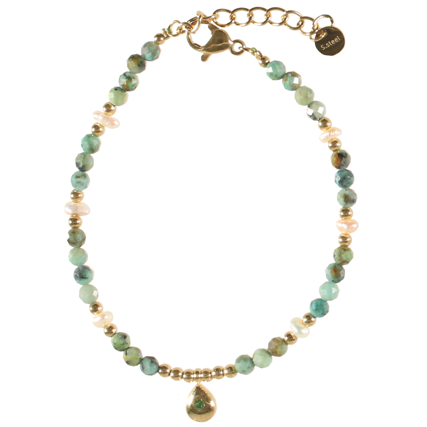 Bracelet composé de perles en acier doré, de perles de couleur verte, de perles de nacre et d'une goutte en acier doré sertie d'un cristal de couleur verte.
