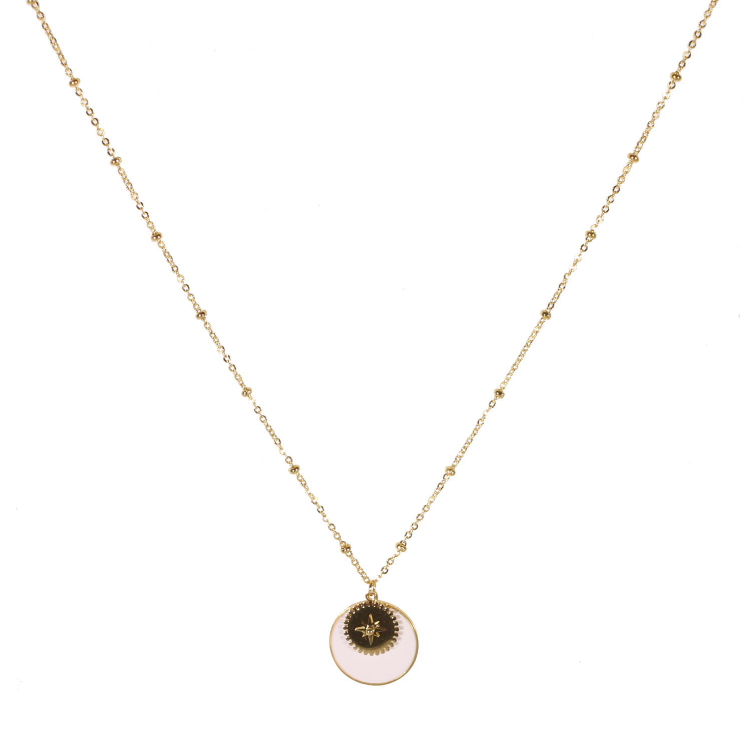 Description Collier composé d'une chaîne, d'un pendentif rond avec une étoile en acier doré et d'un pendentif rond pavé d'émail de couleur blanche. Fermoir mousqueton avec 5 cm de rallonge. Longueur 41+5 cm [Guide des tailles] Matière(s) Acier , Email . L'acier utilisé dans la bijouterie existe sous plusieurs qualités. Nous utilisons principalement la qualité 316L, qualité qui est utilisée en chirurgie. Cet acier est donc inoxydable et reste très résistant. Fermoir Mousqueton À noter Pendentif 16 mm de diamètre Couleur(s) dominante(s) Blanc , Doré Public Adolescent , Adulte . Genre Femme , Fille . Saison Indémodable . Thème(s) Nature . Cliquez sur une matière, un thème, une couleur ou une collection pour voir tous les articles associés.