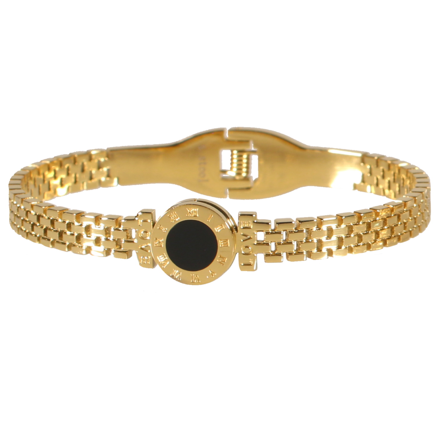 Bracelet jonc fermé rigide en acier doré surmonté d'une pastille ronde avec numérotation horaire sertie clos d'une pierre lisse de couleur noire et les inscriptions Love.