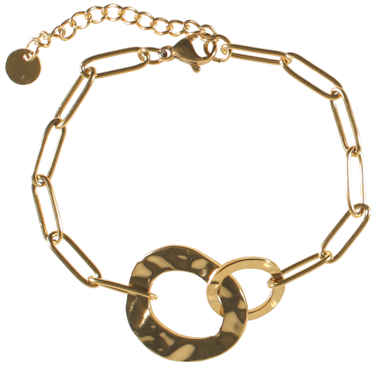 Description Bracelet composé d'une chaîne avec deux cercle martelés entrelacés en acier doré. Fermoir mousqueton avec 3 cm de rallonge. Longueur 16+3 cm [Guide des tailles] Largeur 20 mm Matière(s) Acier . L'acier utilisé dans la bijouterie existe sous plusieurs qualités. Nous utilisons principalement la qualité 316L, qualité qui est utilisée en chirurgie. Cet acier est donc inoxydable et reste très résistant. Fermoir Mousqueton Couleur(s) dominante(s) Doré Public Adolescent , Adulte . Genre Femme , Fille . Saison Indémodable . Cliquez sur une matière, un thème, une couleur ou une collection pour voir tous les articles associés.