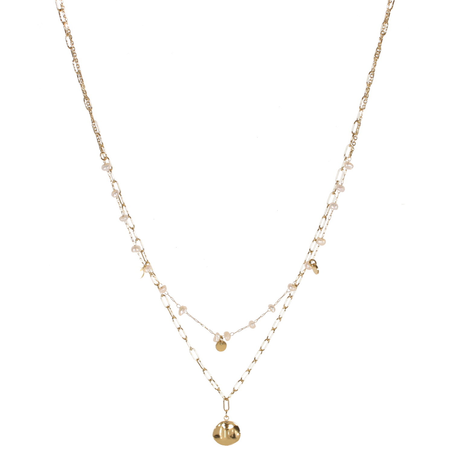 Description Collier double rangs composé d'une chaîne de 39 cm de long avec pampilles rondes en acier doré et de perles de nacre, ainsi qu'une chaîne de 42 cm de long avec un pendentif pastille ronde martelée en acier doré. Fermoir mousqueton avec 5 cm de rallonge. Longueur 39+5 cm [Guide des tailles] Matière(s) Acier , Nacre . L'acier utilisé dans la bijouterie existe sous plusieurs qualités. Nous utilisons principalement la qualité 316L, qualité qui est utilisée en chirurgie. Cet acier est donc inoxydable et reste très résistant. Fermoir Mousqueton Couleur(s) dominante(s) Blanc , Doré Public Adolescent , Adulte . Genre Femme , Fille . Saison Indémodable . Cliquez sur une matière, un thème, une couleur ou une collection pour voir tous les articles associés.