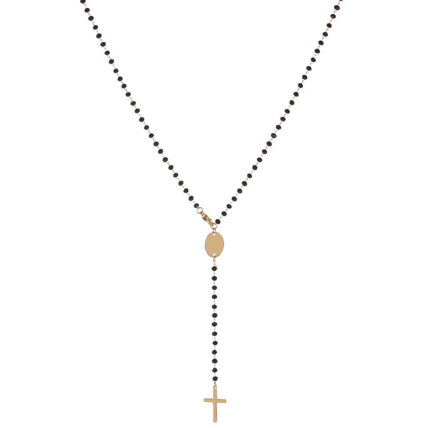 Collier chapelet composé d'une chaîne avec pastille ovale et d'une croix en acier doré et de perles de couleur noire.
