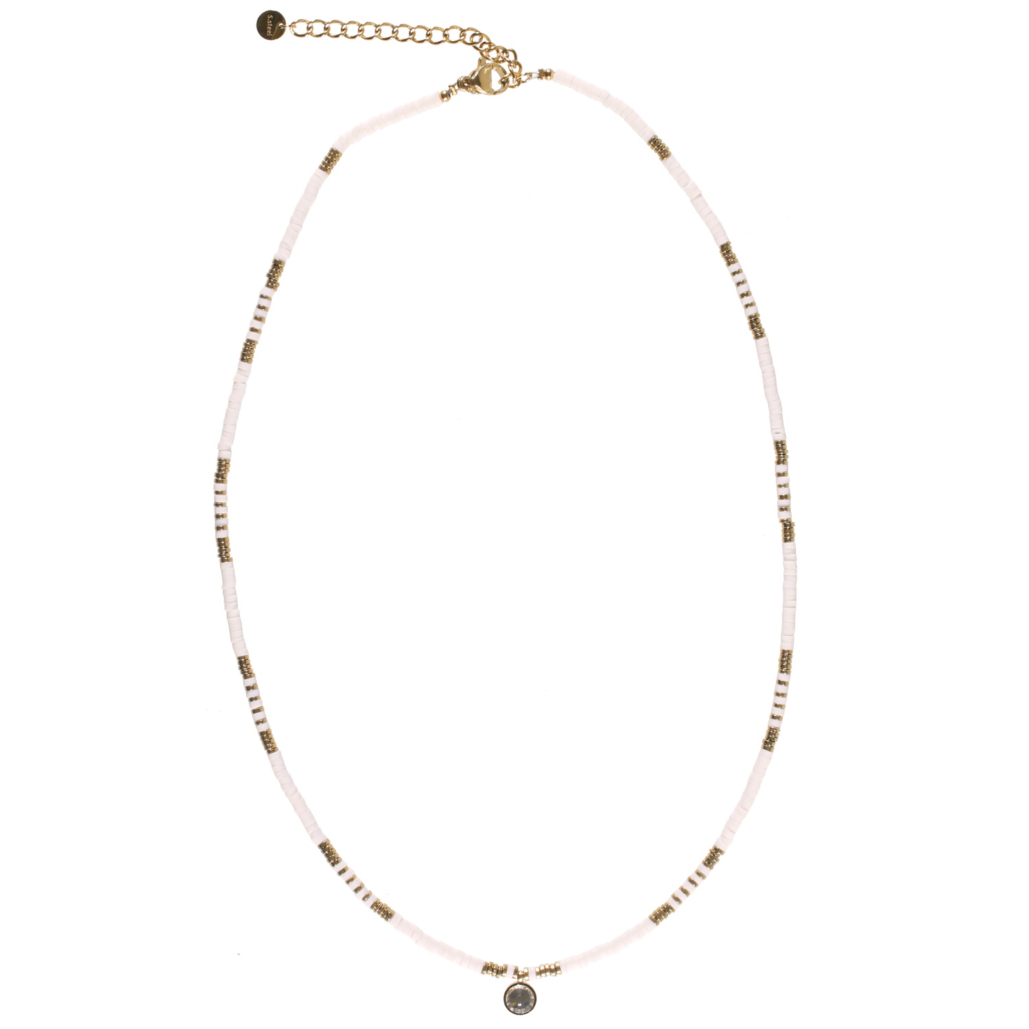 Collier composé de perles cylindriques en acier doré, de perles cylindriques en caoutchouc de couleur blanc et d'un pendentif rond serti d'un cristal.