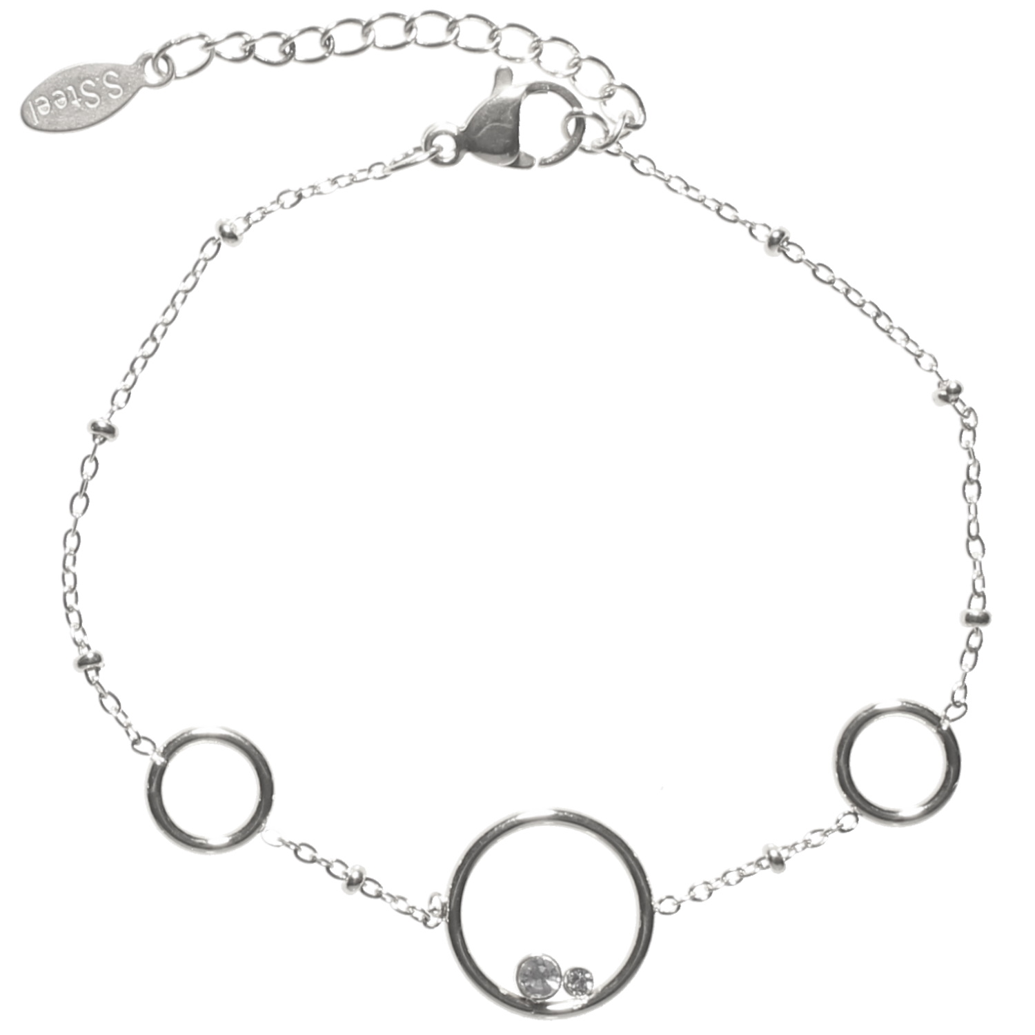 Description Bracelet composé d'une chaîne avec trois cercles en acier argenté et de deux cristaux sertis clos. Fermoir mousqueton avec 3 cm de rallonge. Longueur 16+3 cm [Guide des tailles] Largeur 13 mm Matière(s) Acier , Verre . L'acier utilisé dans la bijouterie existe sous plusieurs qualités. Nous utilisons principalement la qualité 316L, qualité qui est utilisée en chirurgie. Cet acier est donc inoxydable et reste très résistant. Fermoir Mousqueton Couleur(s) dominante(s) Argenté Public Adolescent , Adulte . Genre Femme , Fille . Saison Indémodable . Cliquez sur une matière, un thème, une couleur ou une collection pour voir tous les articles associés.
