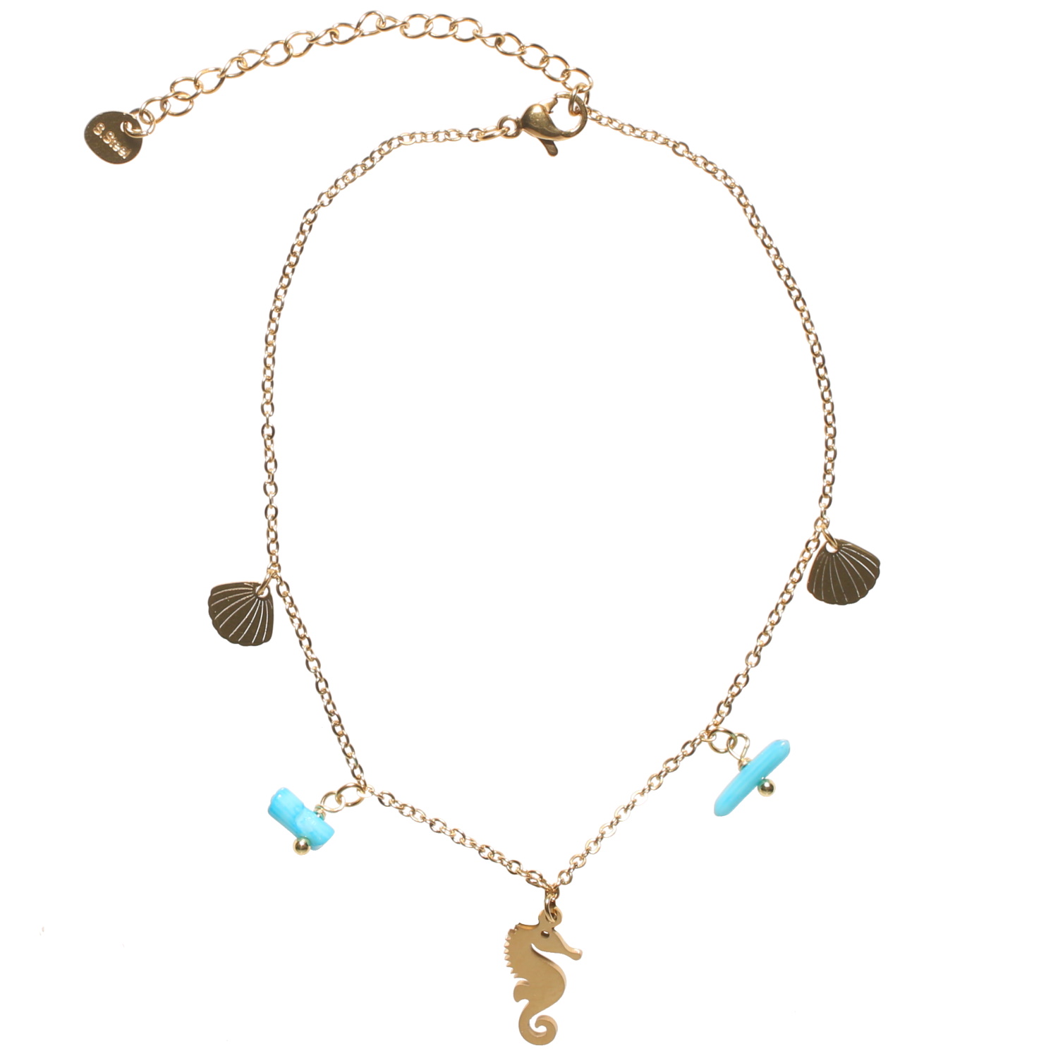 Bracelet chaîne de cheville composé d'une chaîne avec pampilles coquillages et hippocampe en acier doré et de deux pampilles perles de couleur bleue.