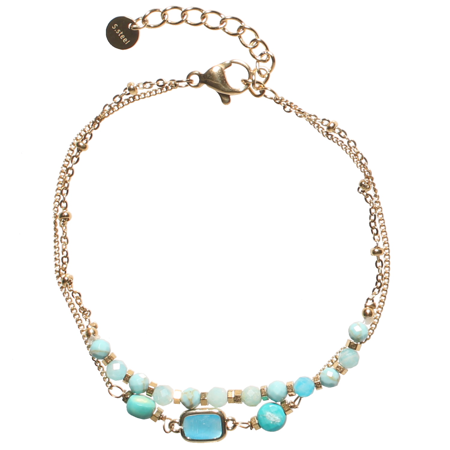 Description Bracelet double rangs composé d'une chaîne en acier doré avec des perles rondes de couleur bleue turquoise, ainsi qu'une chaîne en acier doré avec deux perles rondes de couleur bleue turquoise et d'un cristal bleu turquoise serti clos. Fermoir mousqueton avec 3 cm de rallonge. Longueur 15+3 cm [Guide des tailles] Largeur 8 mm Matière(s) Acier , Rocaille . L'acier utilisé dans la bijouterie existe sous plusieurs qualités. Nous utilisons principalement la qualité 316L, qualité qui est utilisée en chirurgie. Cet acier est donc inoxydable et reste très résistant. Fermoir Mousqueton Couleur(s) dominante(s) Bleu , Doré Public Adolescent , Adulte . Genre Femme , Fille . Saison Indémodable . Cliquez sur une matière, un thème, une couleur ou une collection pour voir tous les articles associés.