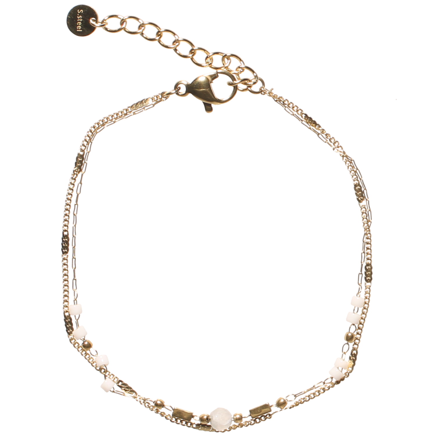 Description Bracelet double rangs composé d'une chaîne en acier doré, ainsi qu'une chaîne en acier doré avec des perles cylindriques de couleur blanche et une perle ronde de couleur blanche. Fermoir mousqueton avec 3 cm de rallonge. Longueur 16+3 cm [Guide des tailles] Largeur 4 mm Matière(s) Acier , Rocaille . L'acier utilisé dans la bijouterie existe sous plusieurs qualités. Nous utilisons principalement la qualité 316L, qualité qui est utilisée en chirurgie. Cet acier est donc inoxydable et reste très résistant. Fermoir Mousqueton Couleur(s) dominante(s) Blanc , Doré Public Adolescent , Adulte . Genre Femme , Fille . Saison Indémodable . Cliquez sur une matière, un thème, une couleur ou une collection pour voir tous les articles associés.