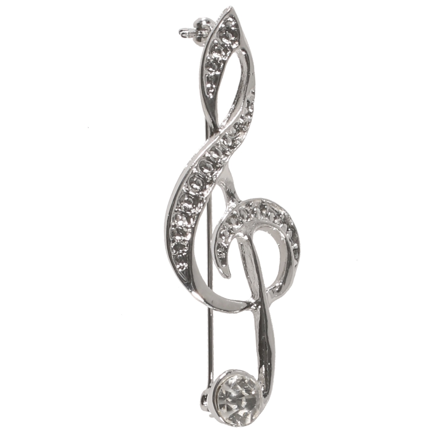 Broche fantaisie note de musique en métal argenté et strass couleur cristal.